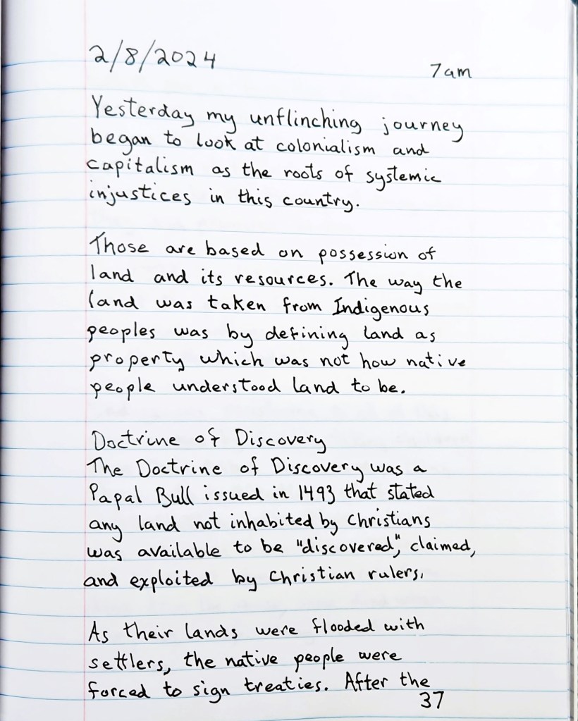 Yesterday my unflinching journey began to look at colonialism and capitalism as the roots of systemic injustices in this country. Today’s post is about land as property, the Doctrine of Discovery, and the current controversy about returning the land the John Woolman school sits on to the Nisenan peoples.