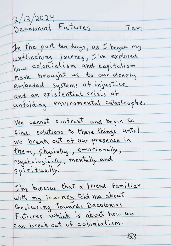I’m blessed that a friend familiar with my journey told me about Gesturing Towards Decolonial Futures which is about how we can break out of colonialism.