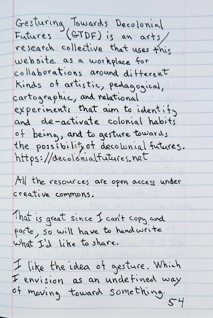 Gesturing Towards Decolonial Futures (GTDF) is an arts/research collective that uses this website as a workplace for collaborations around different kinds of artistic, pedagogical, cartographic, and relational experiments that aim to identify and de-activate colonial habits of being, and to gesture towards the possibility of decolonial futures.