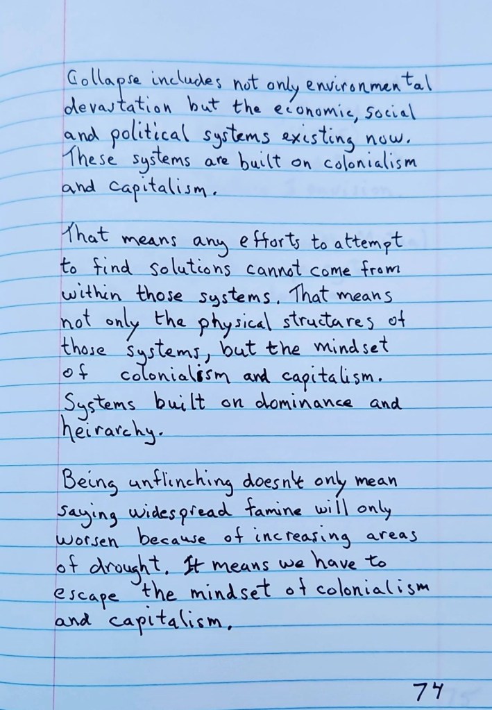 Collapse includes not only environmental devastation but the economic, social and political systems existing now. These systems are build on colonialism and capitalism.