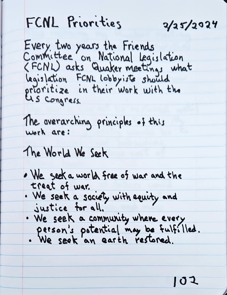 Every two years the Friends Committee on National Legislation asks Quaker meetings what legislation FCNL lobbyists should prioritize in their work with the US Congress.