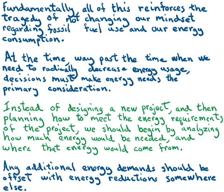 Instead of designing a new project, and then planning how to meet the energy requirements of the project, we should begin by analyzing how much energy would be needed, and where that energy would come from. Any additional energy demands should be offset with energy reductions somewhere else.