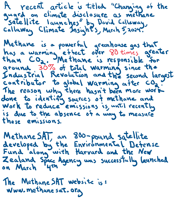 A recent article is titled “Changing of the guard on climate disclosure as methane satellite launches.” MethaneSAT will accurately measure global methane emissions in real time, and the data will be freely available.