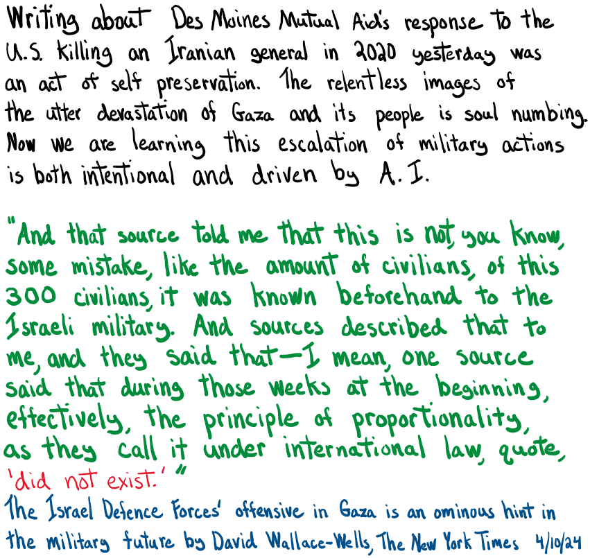Writing about Des Moines Mutual Aid’s response to the U.S. killing of an Iranian general in 2020 yesterday was an act of self-preservation. The relentless images of the utter devastation of Gaza and its people is soul numbing. Now we are learning this escalation of military actions is both intentional and driven by Artificial Intelligence.