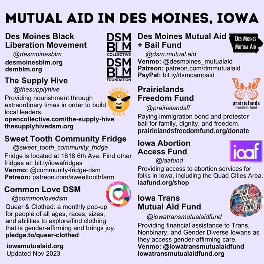 Commonly there are several Mutual Aid projects in a community. The initial projects usually relate to survival needs. One might be a food giveaway. Another helping those who need shelter. Many Mutual Aid groups often have a bail fund, to support those arrested for agitating for change. And accompany those arrested when they go to court.