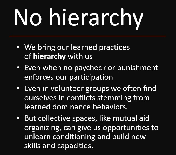 With Mutual Aid, people learn to live in a community where there is no hierarchy. A community where everyone has a voice. A model that results in enthusiastic participation. A model that makes the hierarchy required for white supremacy impossible.