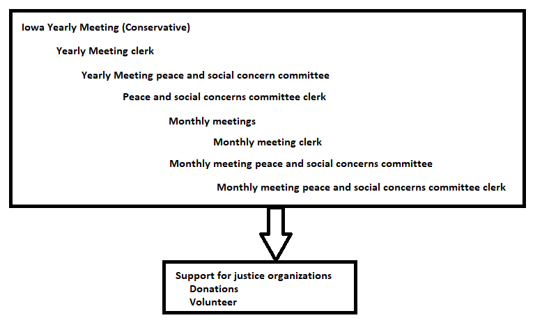 Quakers in unprogrammed/silent worship communities have fewer hierarchies than organized religions, but there are some. This is the hierarchy of our peace and social concerns organization for Iowa Yearly Meeting (Conservative).