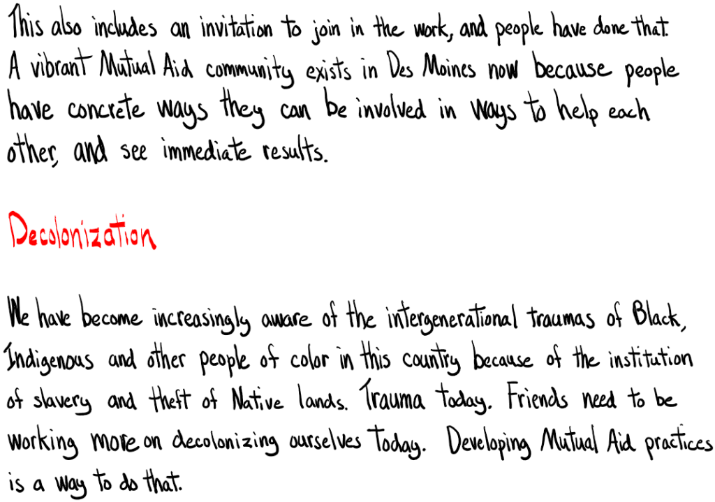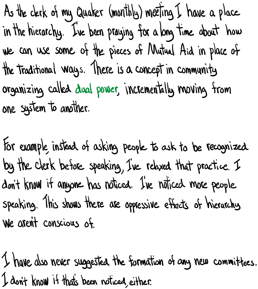I’m having increasing tensions as I’m called to witness against the injustices of colonial capitalism. And to share what I’ve been learning from my leading to join a Mutual Aid community. Those experiences demonstrating more just ways to live and work together. (See also Part 1: Quaker practice and mutual aid)