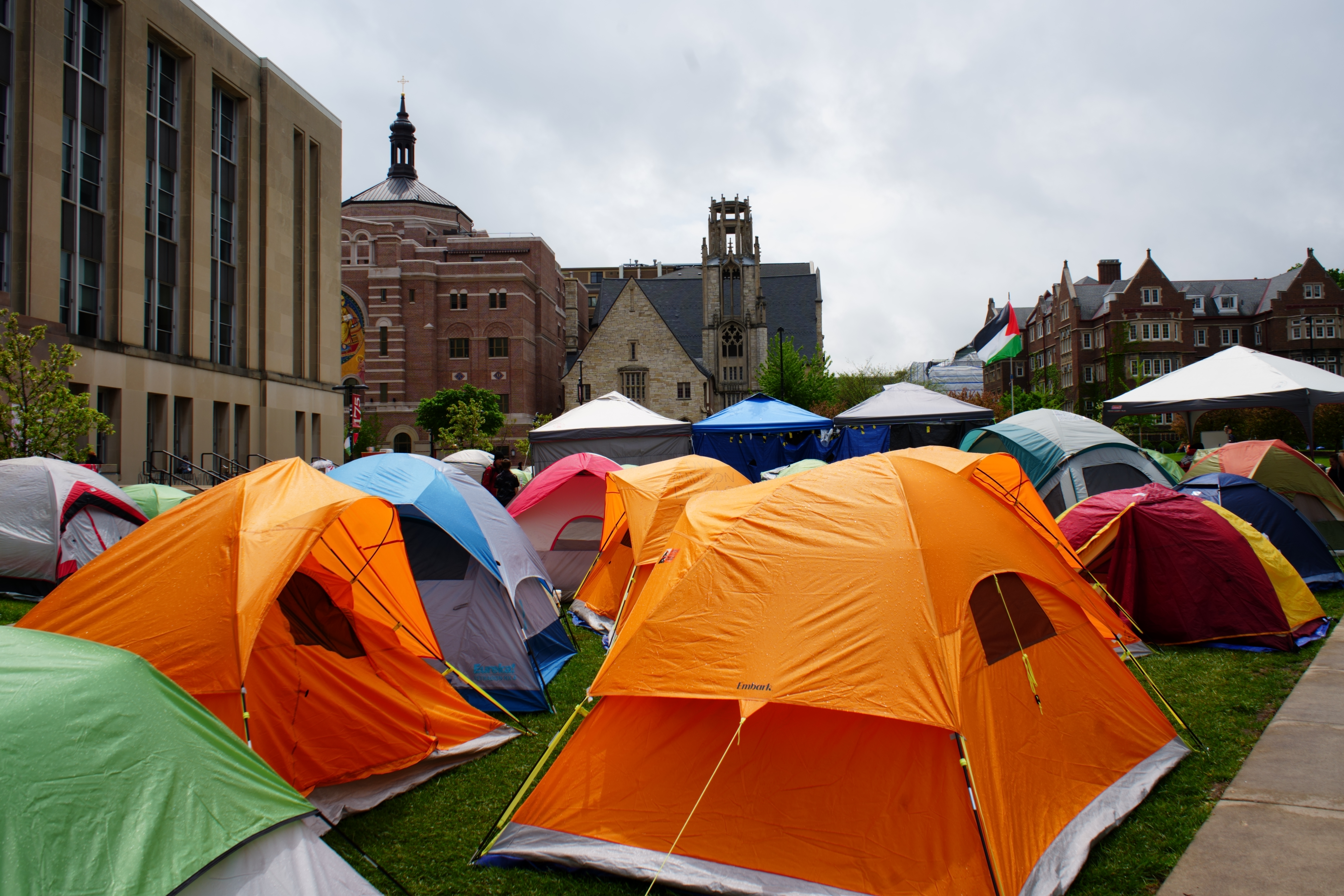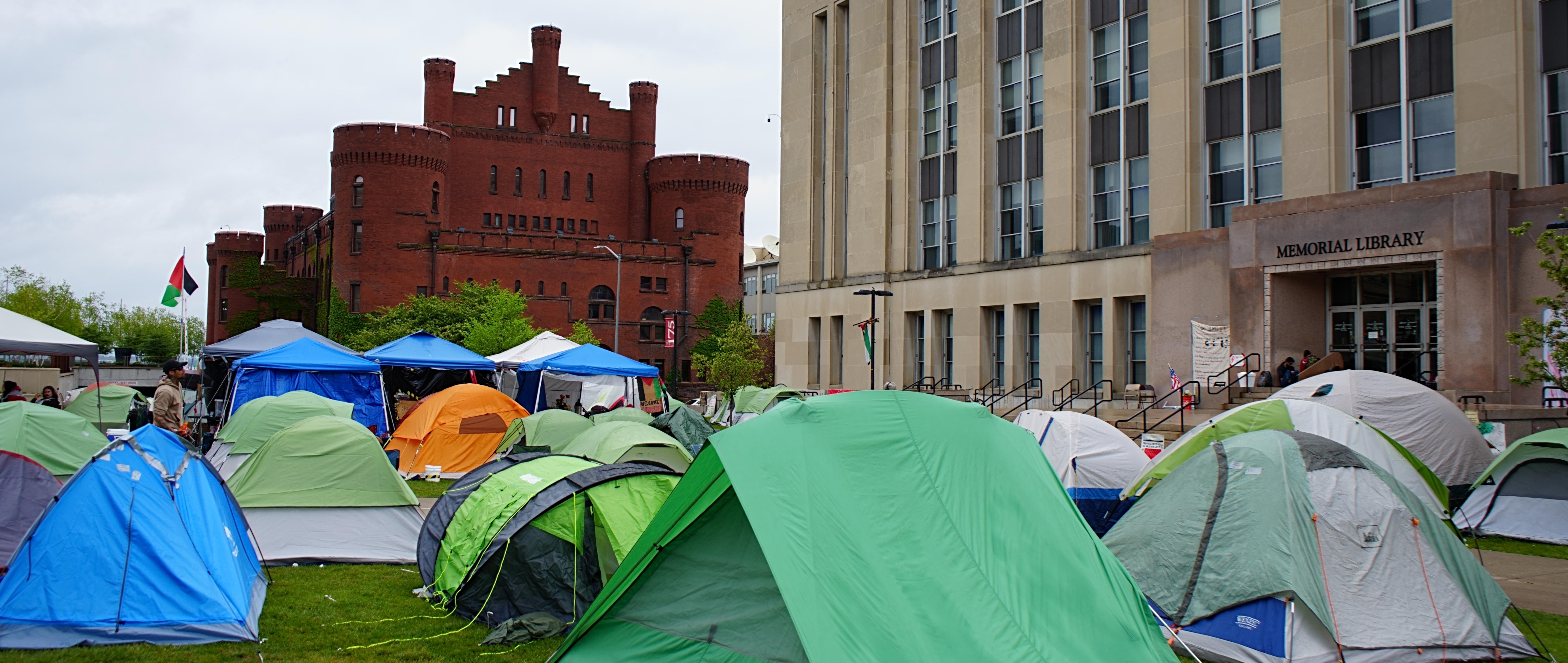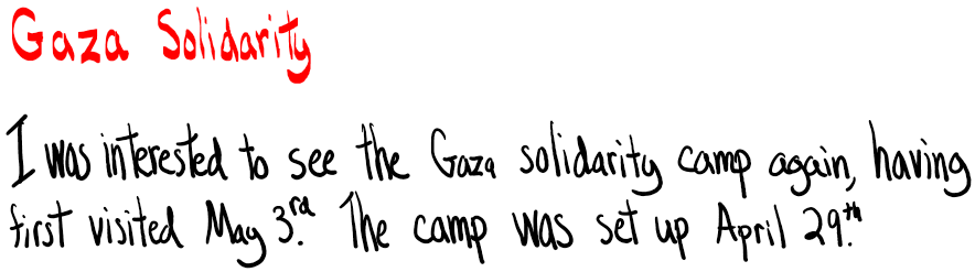Yesterday I again walked to the University of Wisconsin campus in downtown Madison. I was interested to see the Gaza solidarity camp again, having first visited May 3rd. The camp was set up April 29th. On May 1st law enforcement clashed with protesters as they tried to remove the camp, but the students peacefully protected their campsite. Still, some UW faculty were injured, and 34 arrests were made.