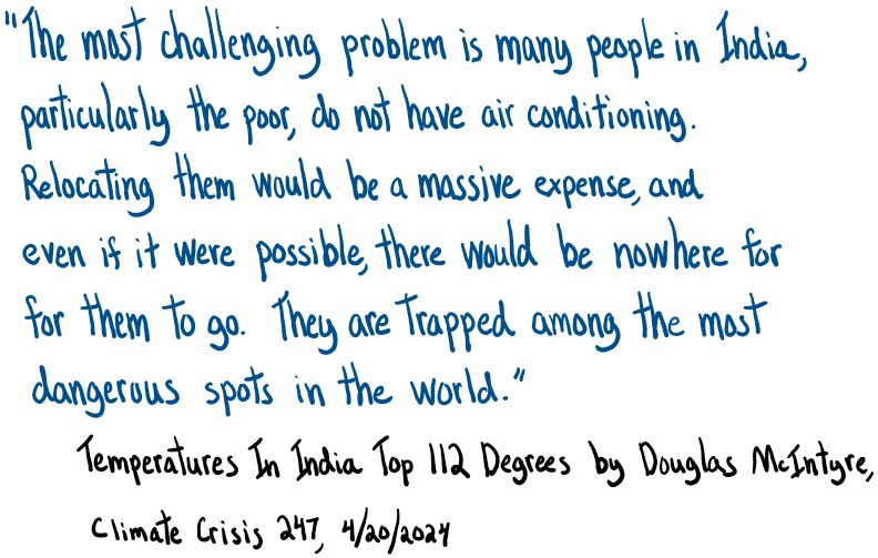 As I wrote a year ago, “Even though I’m a lifelong environmentalist, I’m shocked by the explosion of extreme heat worldwide. I thought we would continue to see the slowly evolving crises as temperatures gradually increased. I thought there would be gradual migrations of people from areas affected by storms, infrastructure destruction, or drought. But now mass migrations look likely to occur soon as people move away from areas of extreme heat.” Extreme Heat, Polycrisis, and Mutual Aid