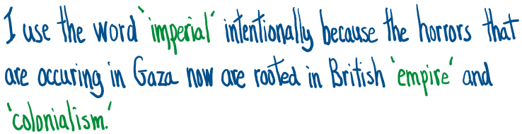 The main vision I was given was to use the atrocities that are occurring in Gaza now to illustrate the consequences of colonialism. Specifically, the parallels between the Middle East, and the colonialism Europeans used to take over this land.