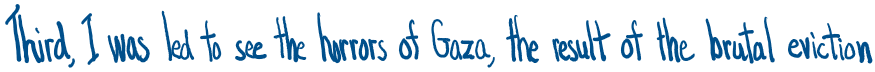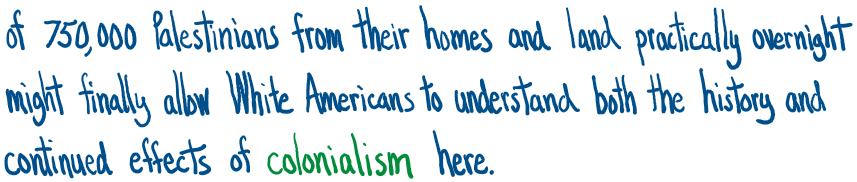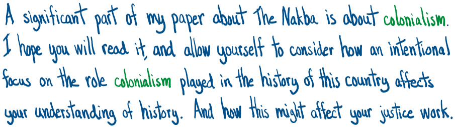 I just took several weeks away from that to research the “Nakba” (meaning ‘catastrophe’) which is how Palestinians refer to the history of 1948, when the British abandoned their imperial presence in the land called Israel. Almost overnight, 750,000 Palestinians were forced to leave their land and homes.