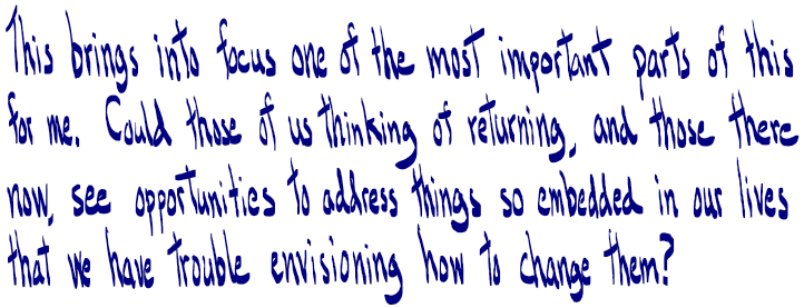 The idea of people returning to the communities they grew up in brings up questions about why they might do that. Are there unrealistic hopes that we can return to a place where we felt valued and safe? The catastrophic damages from environmental chaos, increasingly severe storms and deadly heat, dominate the news. Feeding fears in the face of the increasing uncertainty and collapse of the systems we have depended on.