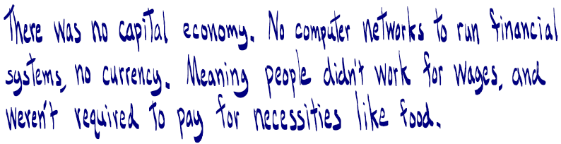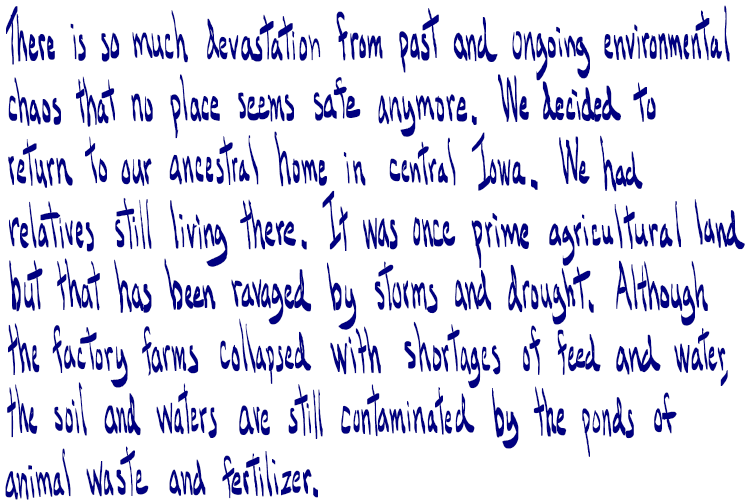 It’s 2025, and a small group of us have left the city. There was no clean water, and it was difficult and dangerous to find and acquire food, now that grocery stores weren’t receiving food shipments. There was no power to refrigerate food. Nor to power air conditioners and fans for the deadly heat.