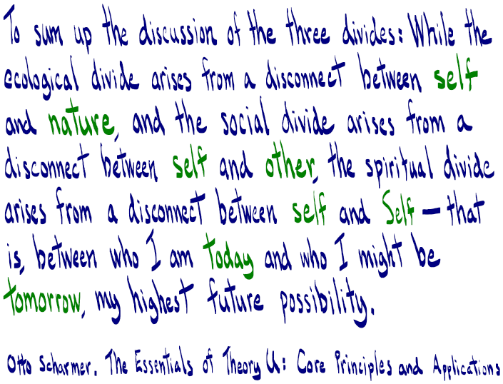 In yesterday’s post, Where is the Hope?, I continued writing what I am learning about Theory U. Theory U has an extensive website: https://www.u-school.org/theory-u. And I’m studying The Essentials of Theory U: Core Principles and Applications, Berrett-Koehler Publishers, Kindle Edition by Otto Scharmer, the originator of many of the theory U ideas.