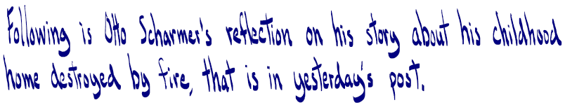 The next day my eighty-seven-year-old grandfather arrived for what would be his last visit to the farm. He had lived in that house all his life, beginning in 1890. Because of medical treatments, he had been away the week before the fire, and when he arrived at the courtyard the day after the fire, he summoned his last energy, got out of the car, and went straight to where my father was working on the cleanup. Without seeming to notice the small fires still burning around the property, he went up to my father, took his hand, and said, “Kopf hoch, mein Junge, blick nach vorn!” (“Keep your head up, my boy, look forward!”) Then, after a few more words, he turned, walked back to the waiting car, and left. A few days later he died quietly.