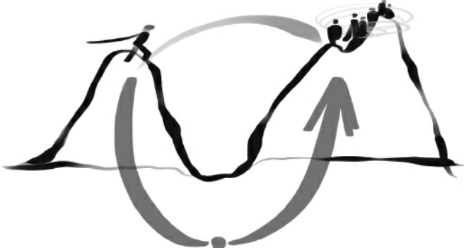 My friend and Presencing Institute co-founder Kelvy Bird captures this felt sense in the image of an abyss. If we picture ourselves on the left-hand side of the image, we can see a world that is disintegrating and dying (the structures of the past); on the right-hand side we see the new mental and social structures that are emerging now. The challenge is to figure out how to cross the abyss that divides the two: how to move from “here” to “there.” This picture, in a nutshell, depicts the journey of this book: the journey across the abyss, from a current reality that is driven by the past to an emerging future that is inspired by our highest future potential.