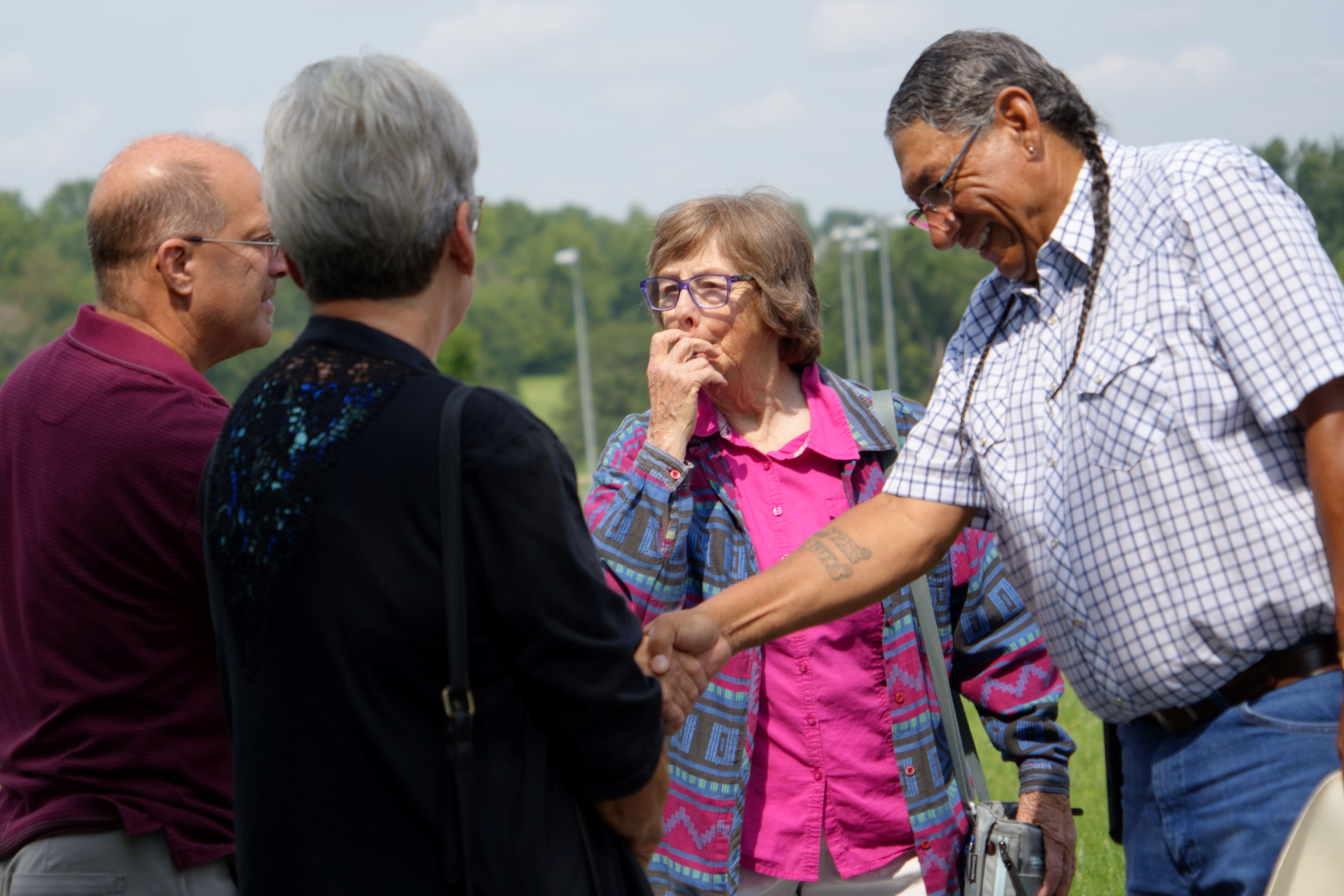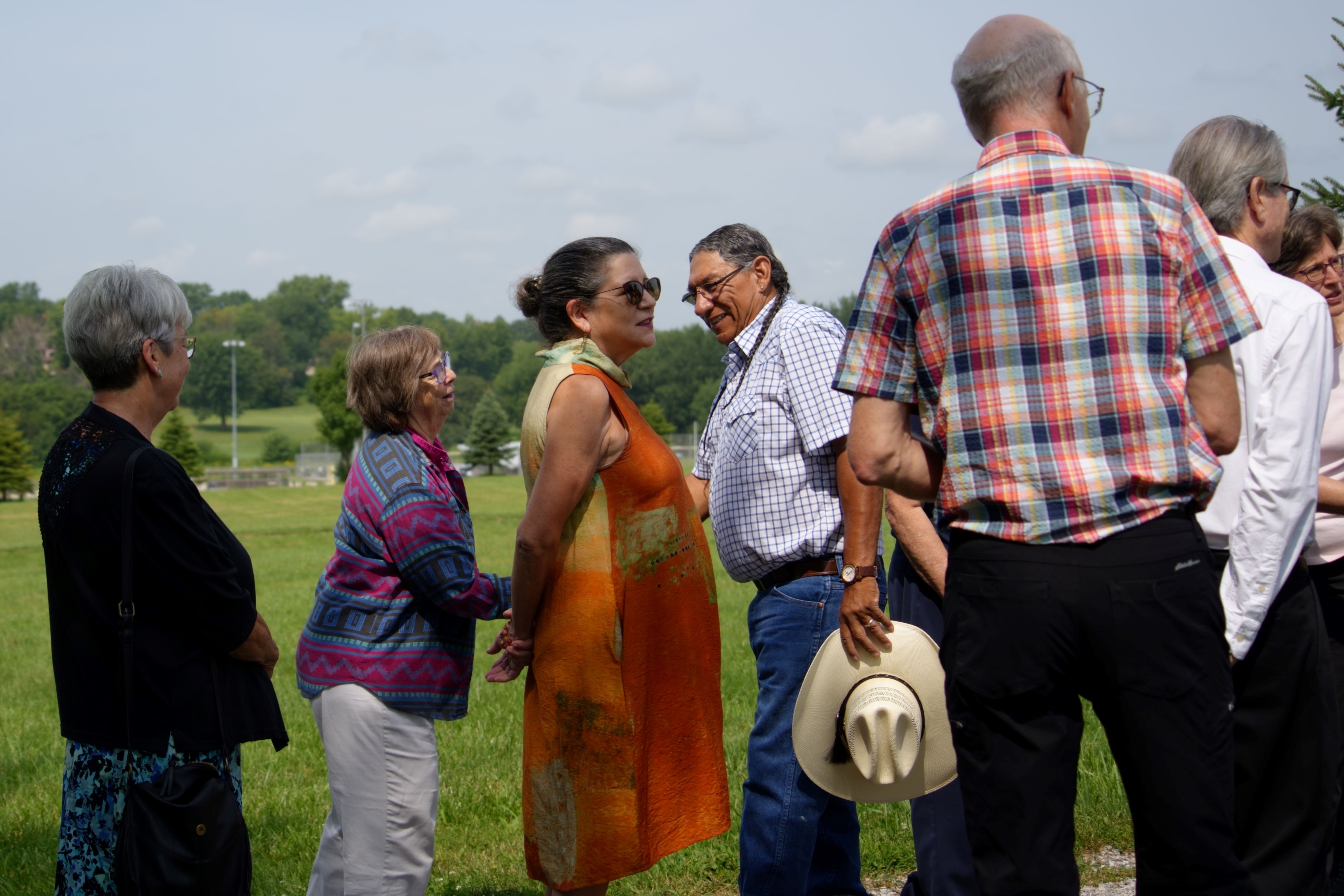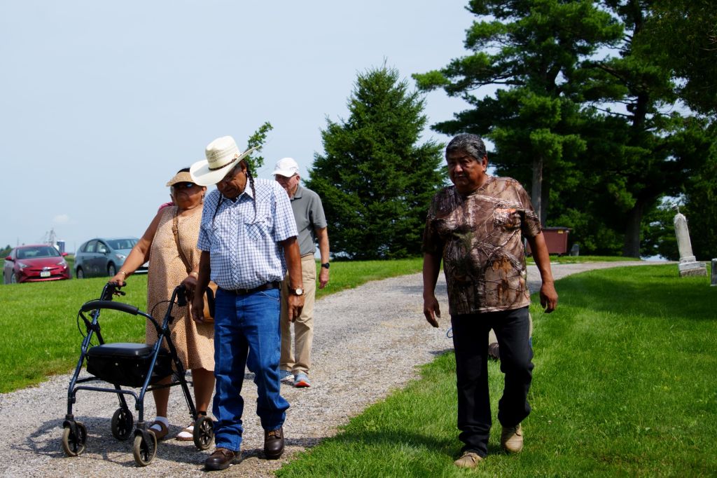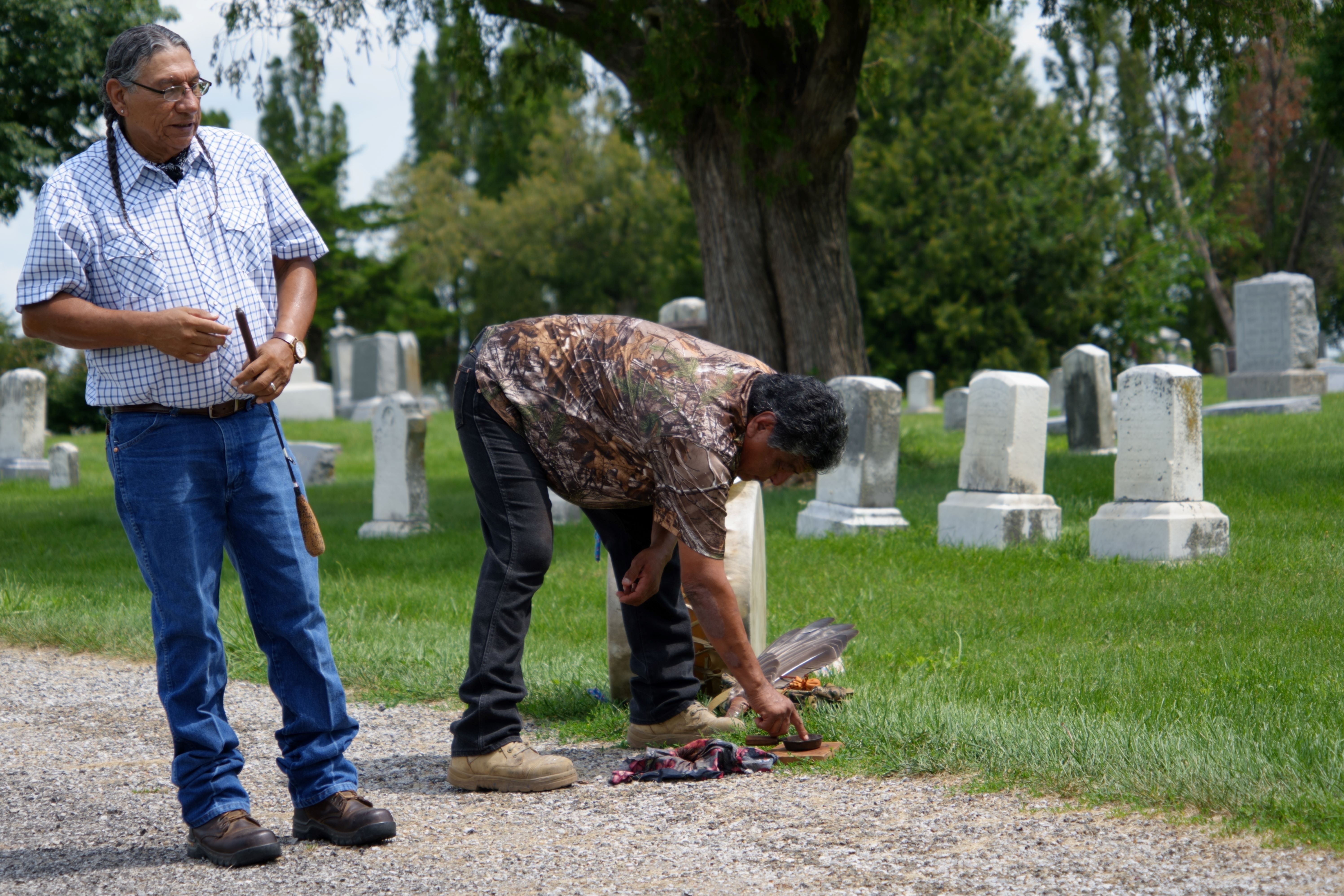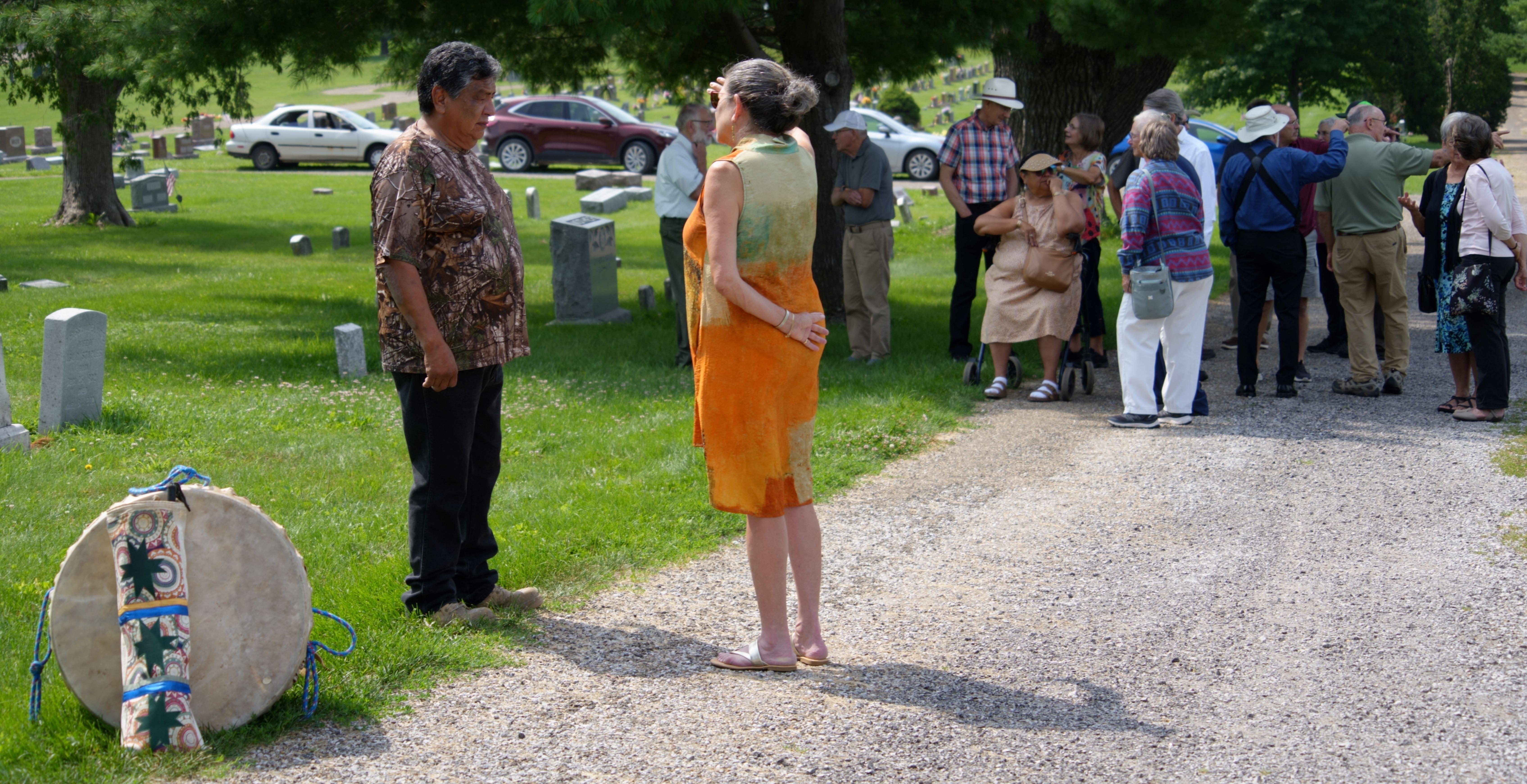 Judy continued correspondence with Fred, in particular about his desire to come to the gravesite. Judy also did research to find the unmarked plots where Grace Yellowhair and Theodore Rodgers, Osage, were buried near each other in the Friends’ section of the West Branch Municipal Cemetery. Before the gathering Monday, white flags had been placed at the site by city staff to mark their location.