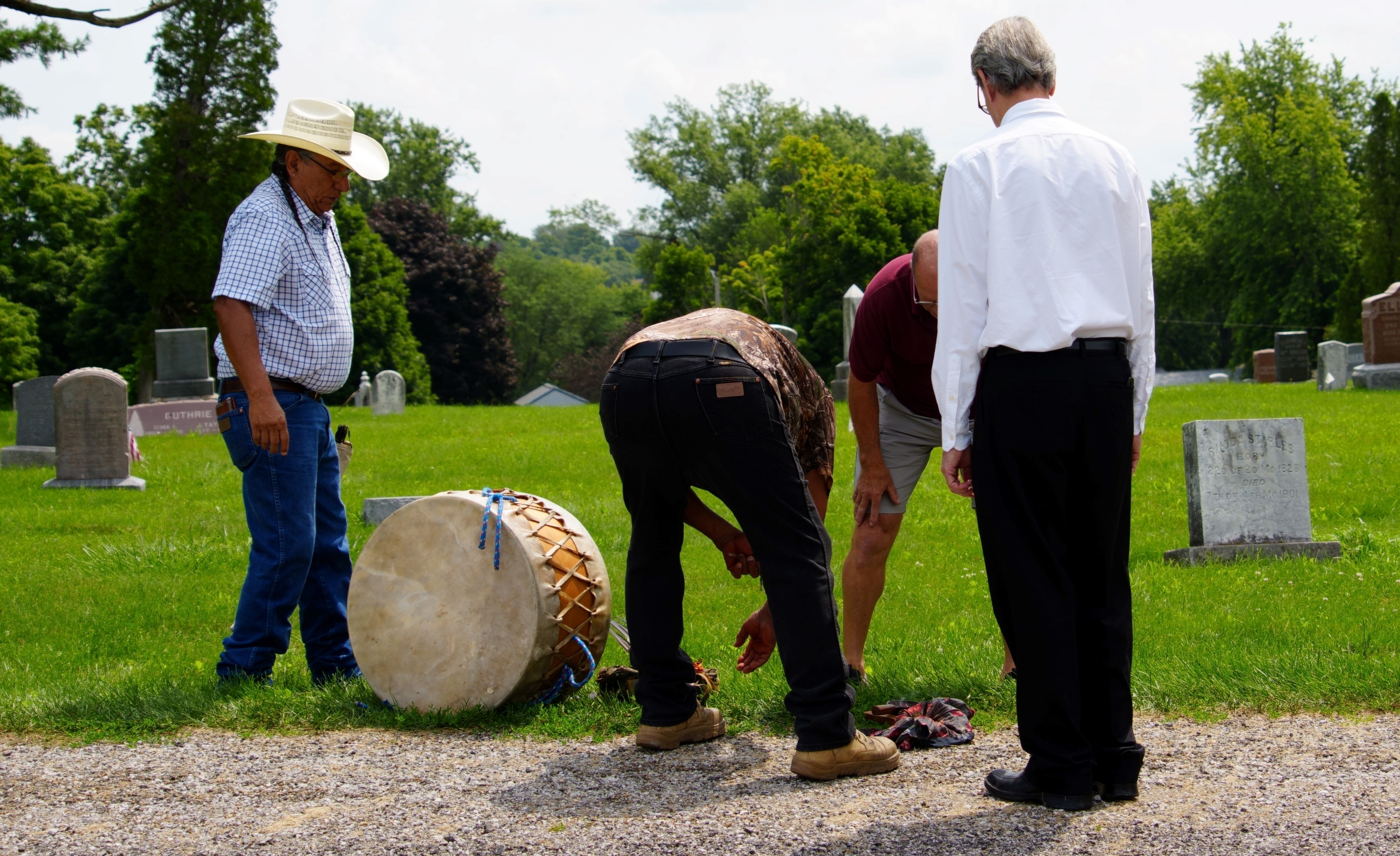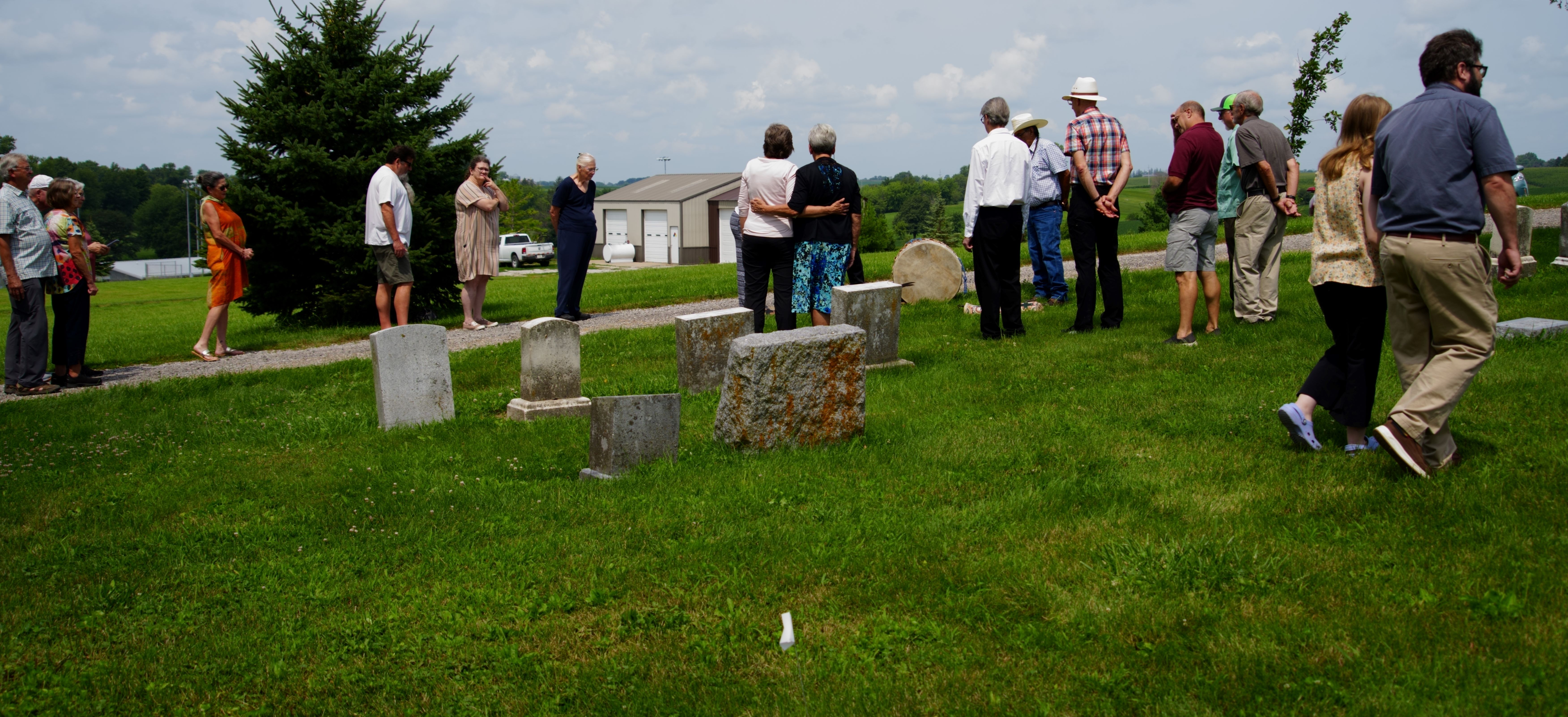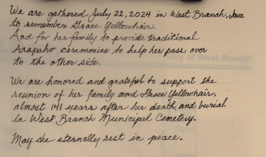 The ceremony was held Monday, July 22nd, at the gravesite of Grace. The Yellowhair family included Theodore Rodgers, Osage, in the prayers to assist him too in passing to the other side. The family did not want a public event. I’m very glad I was able to attend the powerful ceremony. Among the others attending were Judy and her husband Jim Cottingham, a number of members of the West Branch Friends Meeting of Iowa Yearly Meeting (Conservative), West Branch Friends Church, and guests including Peter Hoehnle, and the West Branch mayor.