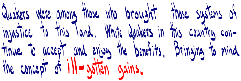 Dispiriting racial complacency is the spiritual message I received this morning. Because the racial behavior of White Quakers is a matter of the Spirit. Quakers say our fundamental spiritual belief is there is that of God in every person and thing. Which just highlights what a contradiction it is when most White Quaker’s lives are not consistent with that. It took me a very long time to understand there is often an unspoken understanding that there is that of God in everyone, but not everyone is equal. I find that simply shocking. Much of my frustration is most White Quakers refuse to examine any of these considerations.