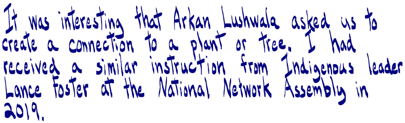 I just returned from an amazing event, the National Network Assembly, held at the Des Moines YMCA Camp near Boone, Iowa. From information about the Assembly we received ahead of time, I knew I wouldn’t have WiFi or cell phone access, so I didn’t even bring my laptop. As I mentioned in yesterday’s post though, there were so many things I wanted to write about and I was missing my (nearly) daily writing, so I wrote two blog posts by hand.
