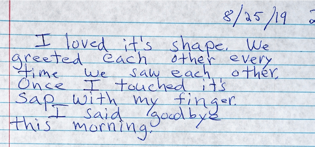 The following is from the blog post, “My Tree Friend”, written 8/26/2019.