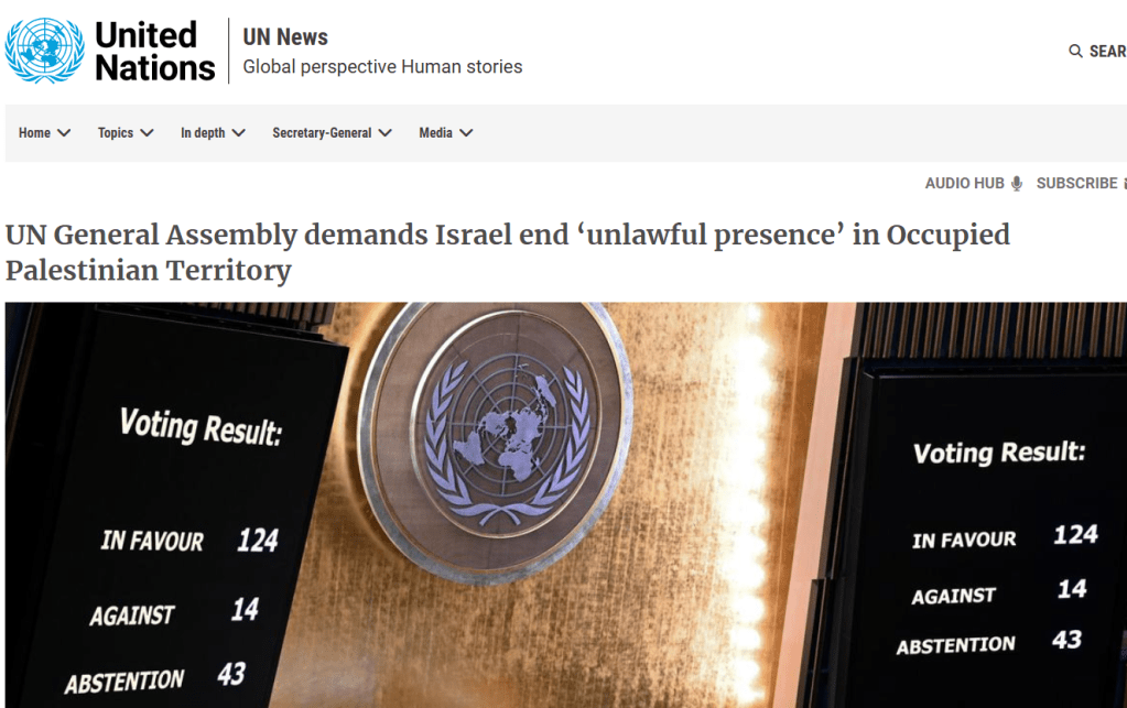 Yesterday the UN General Assembly passed a resolution demanding Israel end ‘unlawful presence’ in Occupied Palestinian Territory.