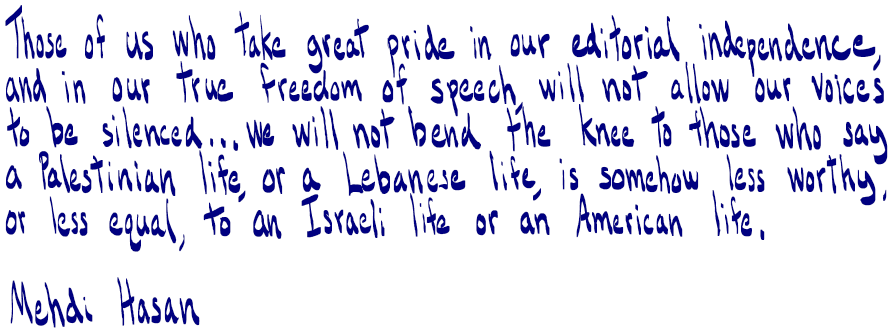 Those of us who take great pride in our editorial independence, and in our true freedom of speech, will not allow our voices to be silenced… we will not bend the knee to those that say a Palestinian life, or a Lebanese life, is somehow less worthy, or less equal, to an Israeli life or an American life.