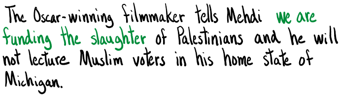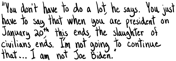 It adds that “we simply cannot support a candidate who participated in a genocide and now refuses to lay out any plan to end that genocide”.