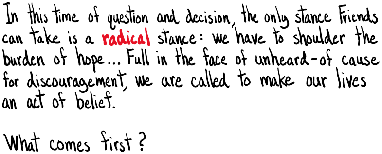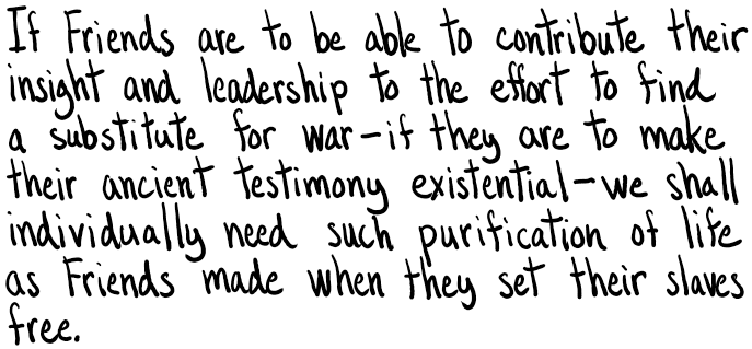 Corporately, we have never known, since Friends were first out of the early persecutions, such a purification as we shall need now. What is this worldliness which I say is throttling our witness and giving the hollow ring of pretension to what we say? It is chiefly characterized by our uncritical and insensitive attitude toward our insatiable material wants. . . [We] make a god of the American standard of living, with its implications of competition and oppression, its dependence on preparation for war, not to say mongering of war, and with its effect of speeding up our lives, dispersing out attention, squandering our powers. . .