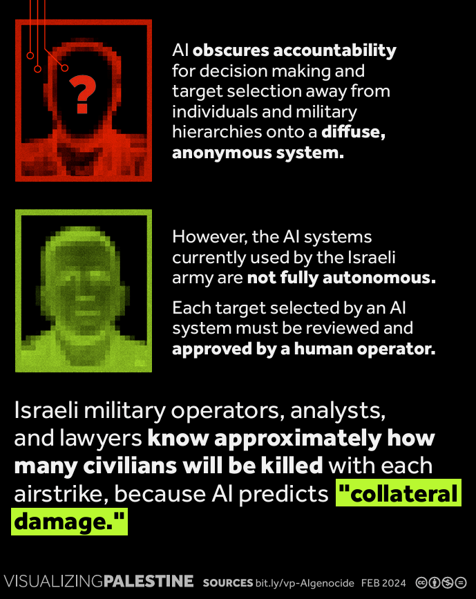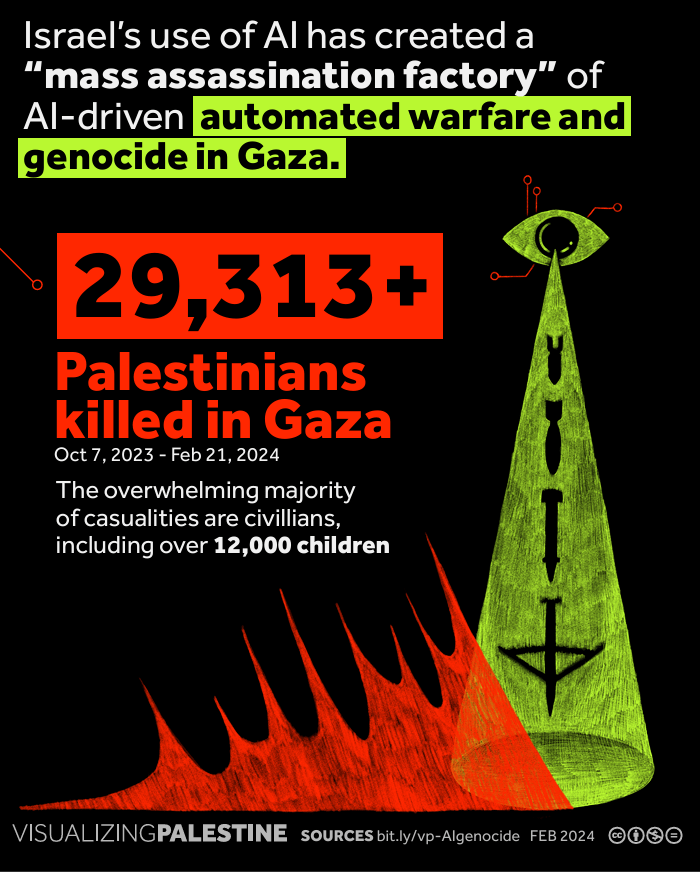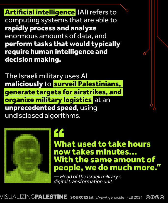In 2021, after killing 230 Palestinians in 11 days in Gaza, the Israeli military bragged about deploying new AI technology to operate a faster and deadlier assault. In 2023-2024, this technology is automated genocide, producing an “unprecedented and unparalleled” rate of destruction and civilian death in Gaza.