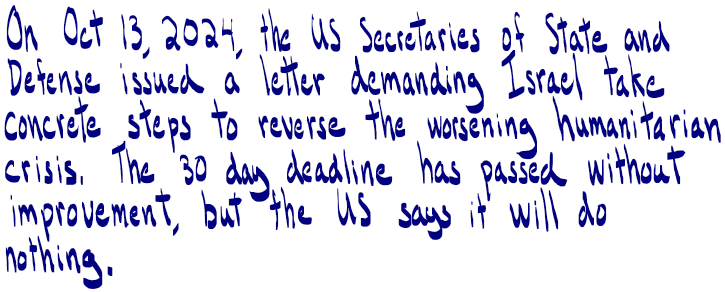 On October 13, 2024, the U.S. Secretaries of State and Defense issued a letter demanding that Israel make concrete progress within 30 days on measures to reverse the spiraling humanitarian situation. These demands align with U.S. legal requirements under Section 620i of the Foreign Assistance Act, which requires that the President halt security assistance to any foreign government that restricts U.S. humanitarian aid. These are legislative requirements that will outlast specific Biden administration policies or initiatives, like the October 13 letter, and will apply to the incoming administration under President elect Trump. These requirements are also germane to other countries’ engagement with the Israeli government: these concrete metrics, demonstrating its failure to comply with U.S. law, underscores its failure to meet its obligations under international