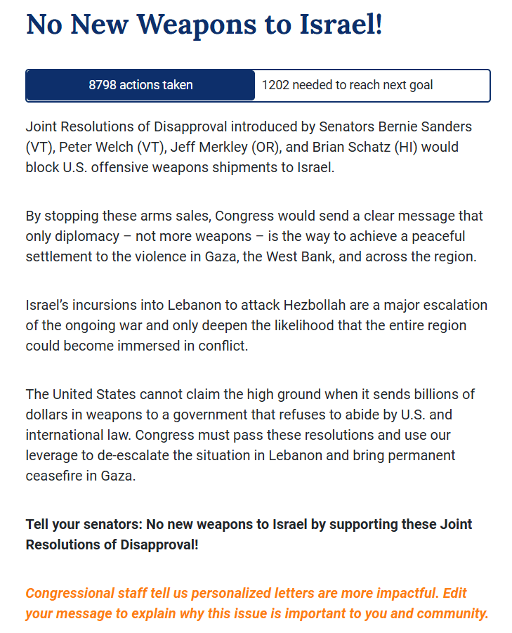 A year of escalating war and violence cannot continue to be rewarded. I urge you to support efforts led by Senators Bernie Sanders, Peter Welch, Jeff Merkley, and Brian Schatz that would block the sale of lethal weapons to Israel through Joint Resolutions of Disapproval.