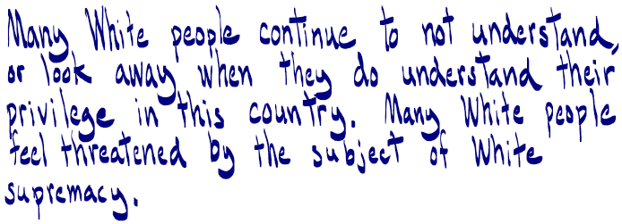 I’ve been working on the following diagram for years as a way to express the relationships between numerous concepts related to justice and peace. The White column shows the systems that come from colonialism and capitalism. The column for Black, Indigenous and other people of color shows the impact of those injustices in these communities that are created by colonialism and capitalism.