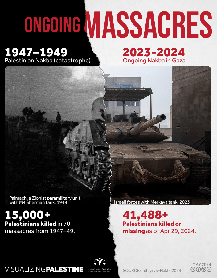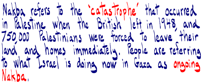 I researched and wrote The Nakba to help me understand that concept and its history. (See below). Infographics from Visualizing Palestine about the ongoing Nakba are also included below.