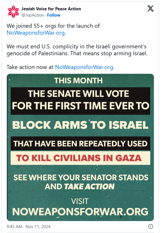 Senate rejects effort to block arms sales to Israel. 18 lawmakers voted for Bernie Sanders’ effort to block arms sales to Israel, but the vast majority of the Senate voted against the measure. By Michael Arria, Mondoweiss, Nov 20, 2024