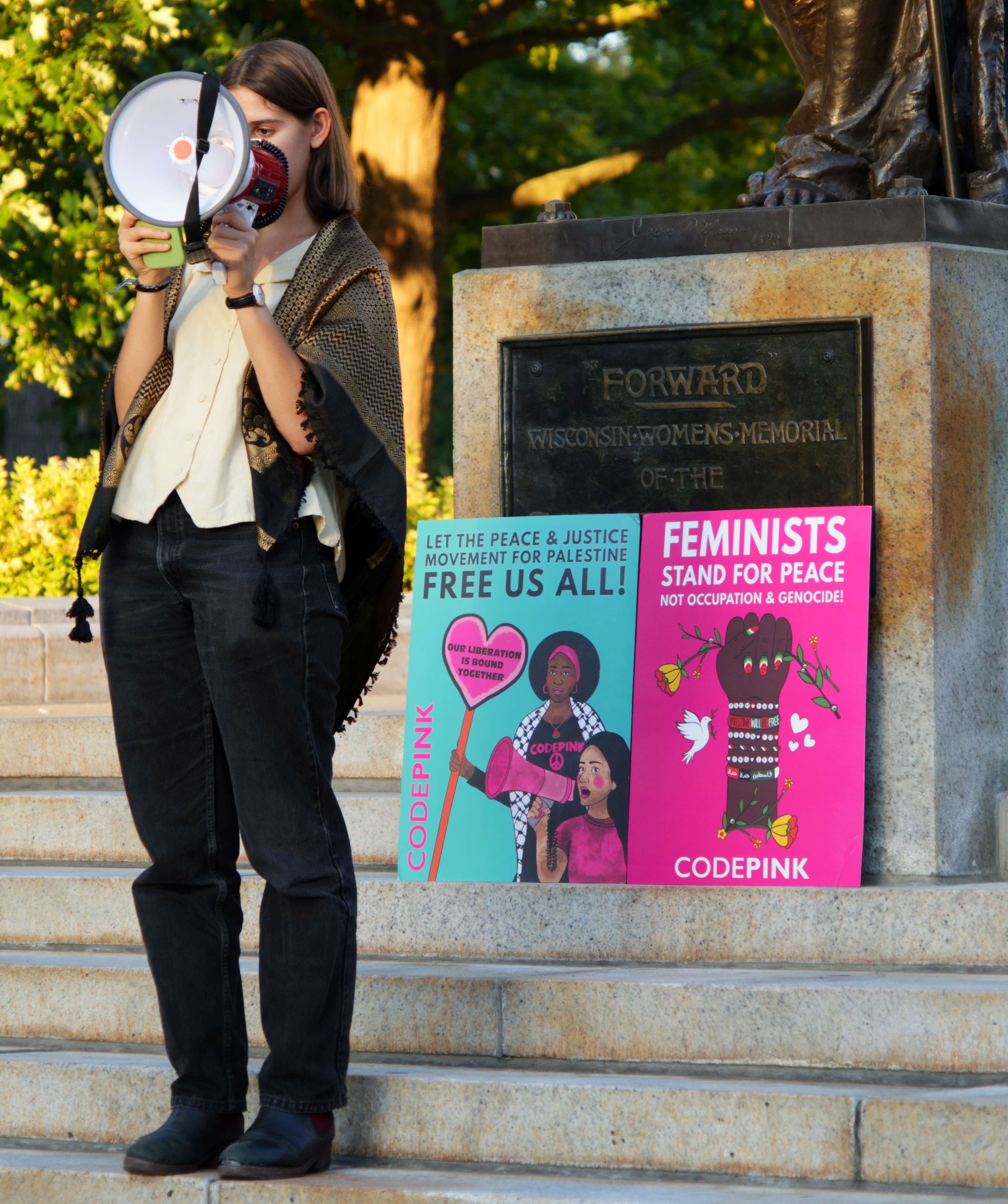 Photo credit: Jeff Kisling. Action photos are from Madison, Wisconsin, including the photo used by CODE PINK. And my monthly meeting, Bear Creek Friends, Iowa Yearly Meeting (Conservative)