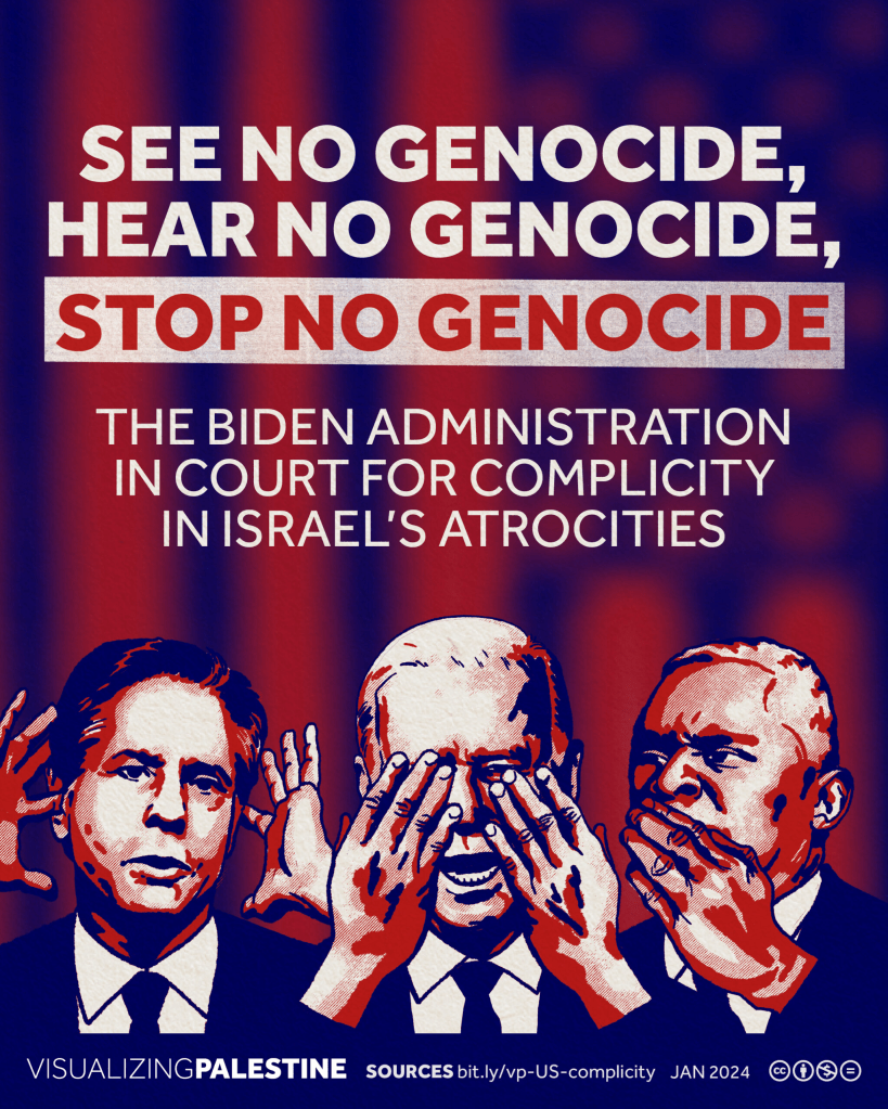 On January 26, 2024, Palestinians took the Biden administration to court, as they have repeatedly refused to use their influence to place limits on Israel’s massive bombing and total siege of Gaza. Instead, their actions to fund, arm, and endorse Israel constitute a failure to prevent genocide and complicity in genocide. This includes denying Israel’s atrocities, offering unconditional support, bypassing Congressional oversight to send funding and weapons to Israel, and vetoing resolutions proposed by the United Nations Security Council.