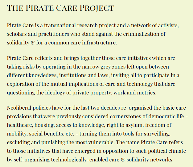 But if Empire is back, then so is its enemy: the pirate. Pirate care is the revolutionary practice of the plebeian multitude against Empire. In potent yet not widely recognized ways, pirate carers are striking back from a position of deep asymmetry. In doing so, they are opening up a space of political possibility. By caring despite the laws and despite all odds, they immanently enact a different, insurgent world.