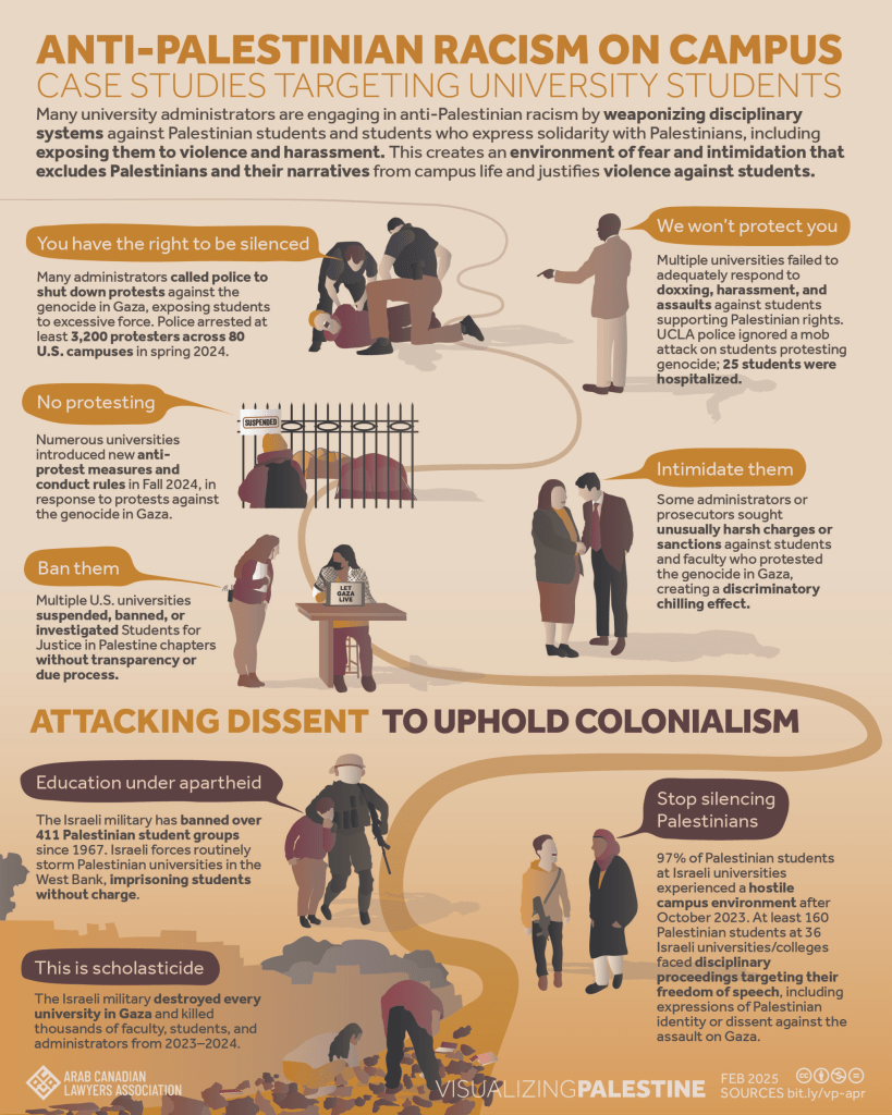 This visual in our series on anti-Palestinian racism captures the systemic abuse of disciplinary measures against Palestinian students and students who express solidarity with Palestinians on college campuses, creating an environment of fear that isolates them from campus life.
