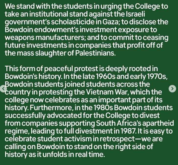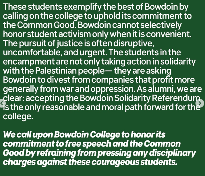 “Today, we launch this encampment, demanding that Bowdoin immediately commit to fully realizing all four demands of our referendum,” the announcement read.