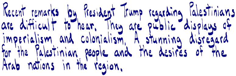 “The king would prefer that the Palestinians stay in place with the additional land to be used for new development, which would greatly create jobs at levels never seen before. The president feels it would be much better and more majestic if these Palestinians could be moved to safer areas,” she said.