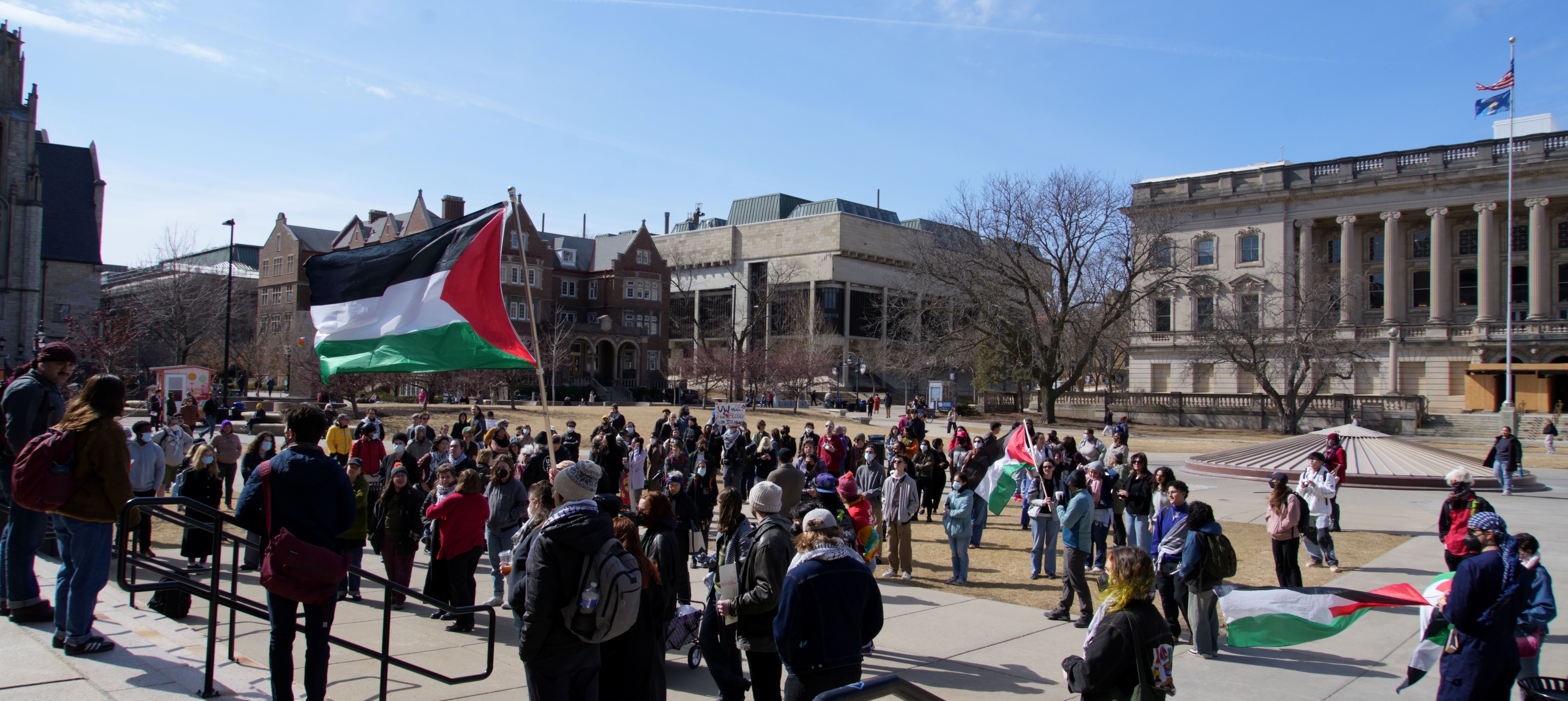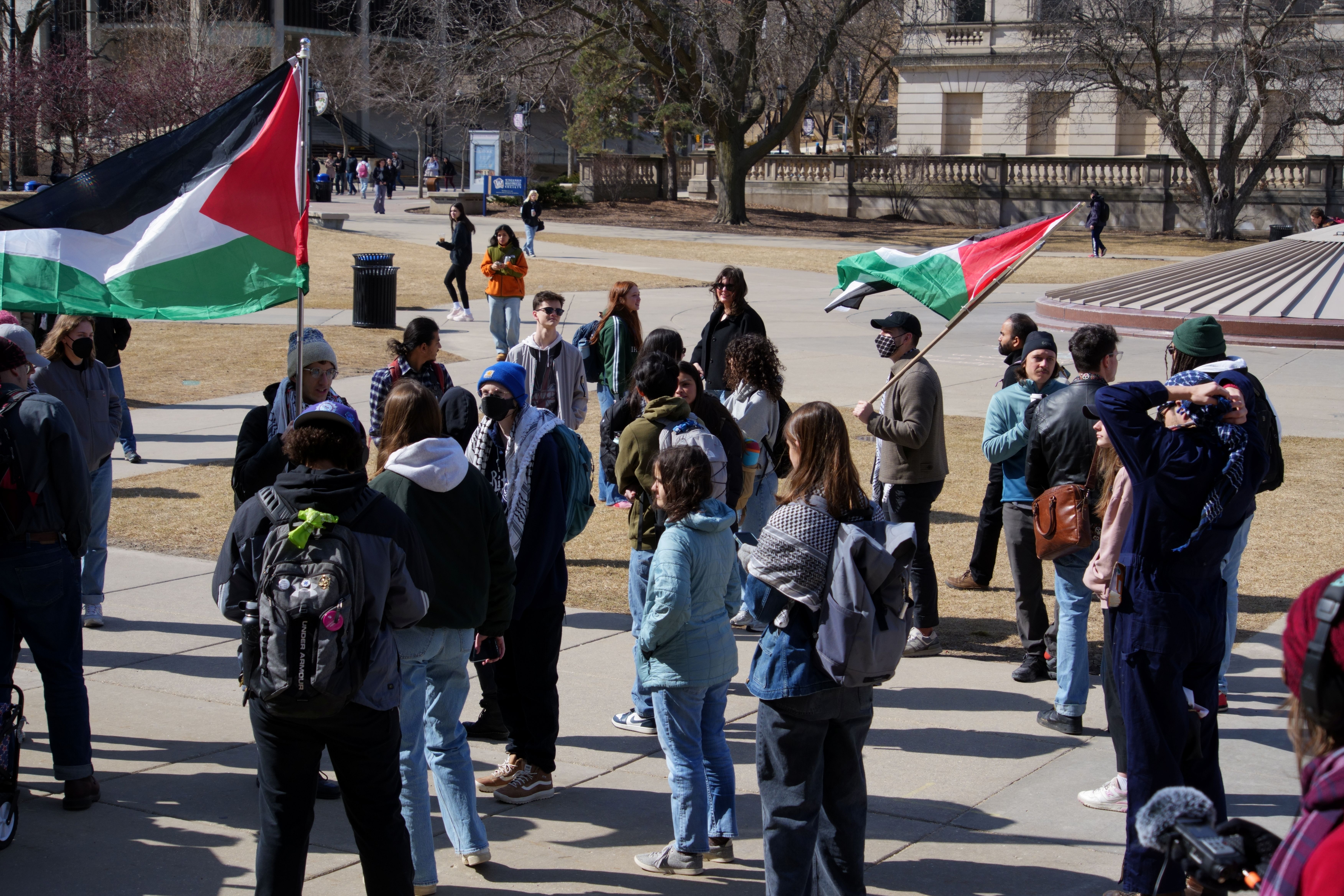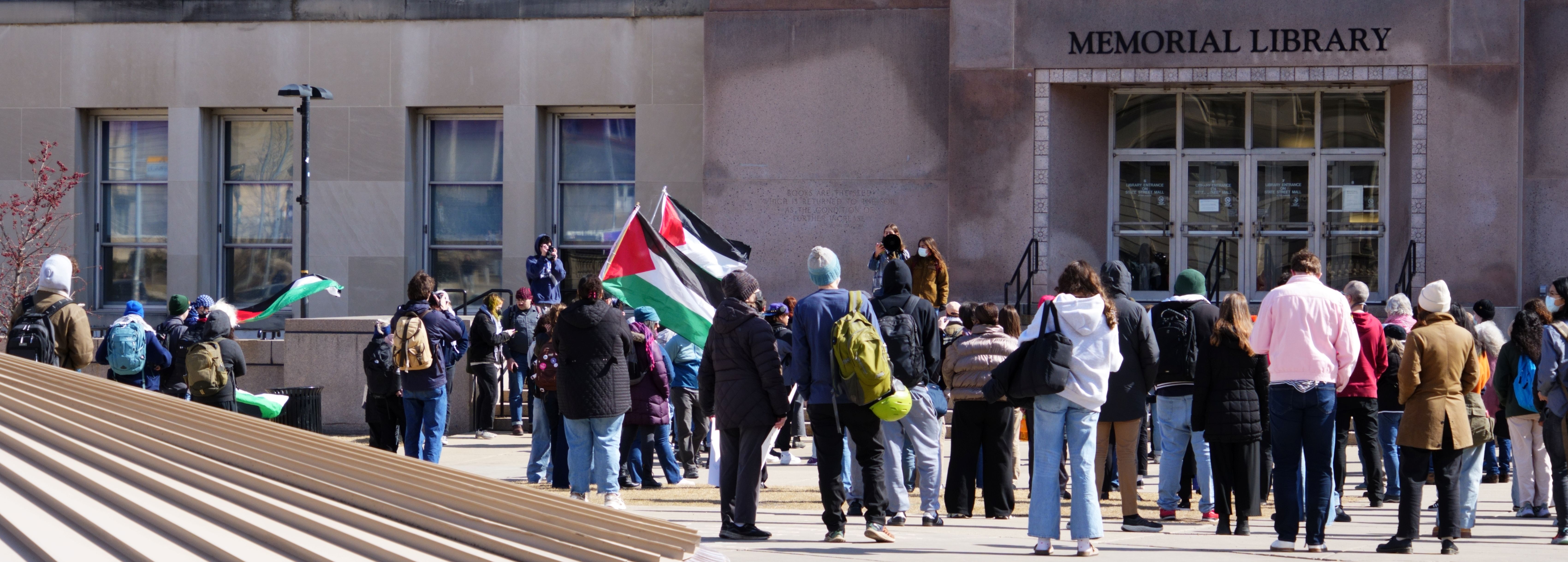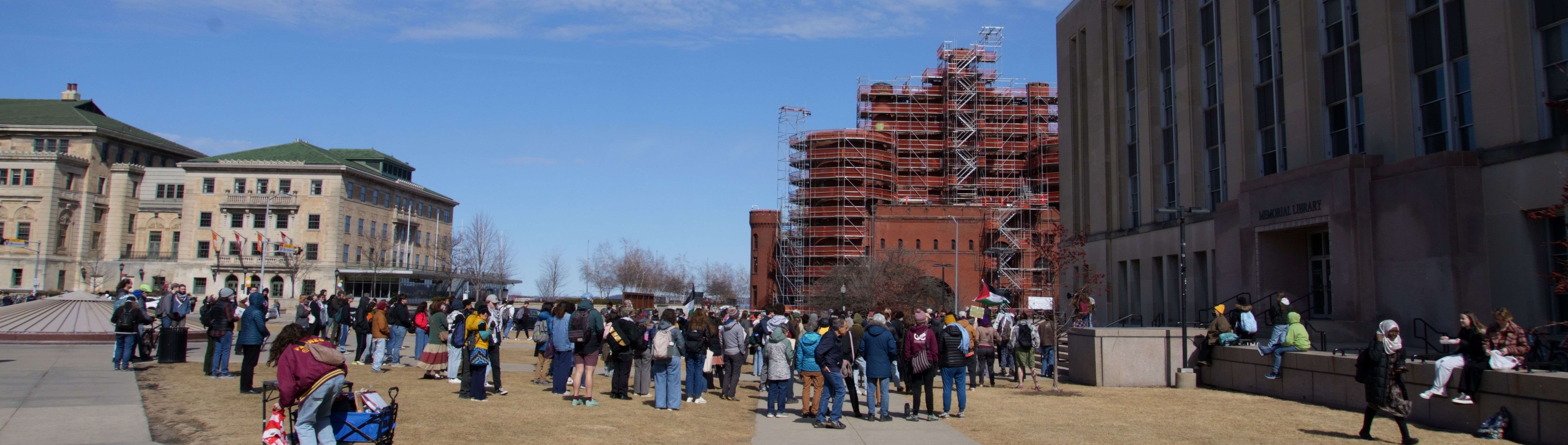 The following photos were taken at “Walk Out for Mahmoud” yesterday on the University of Wisconsin, Madison campus. Another rally is being organized by the Wisconsin Coalition for Justice in Palestine (WCJP), that I am a member of, in Milwaukee on Friday. I arrived at yesterday’s rally early and introduced myself to the small group of organizers getting ready. They were happy to hear of the support from the coalition.
