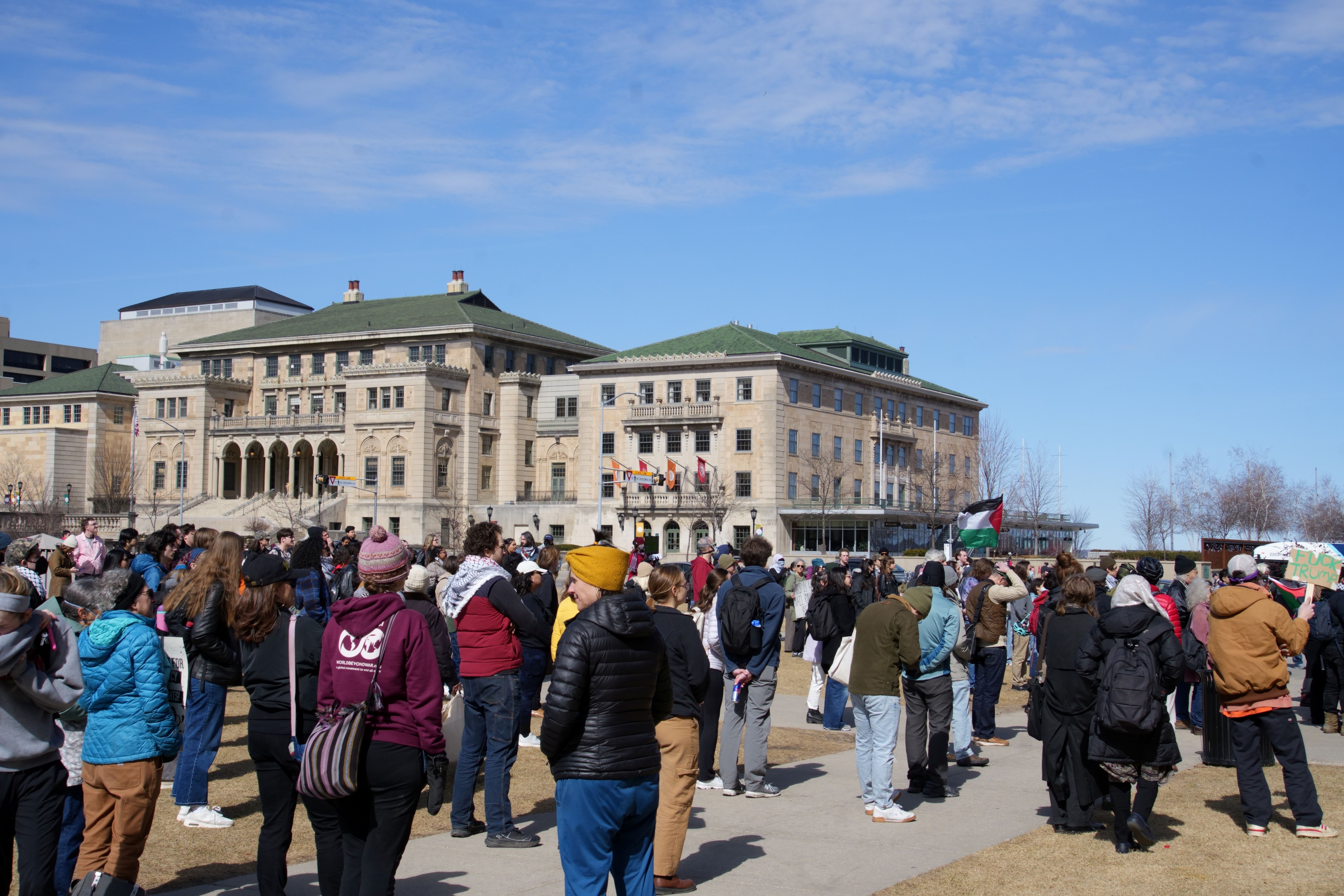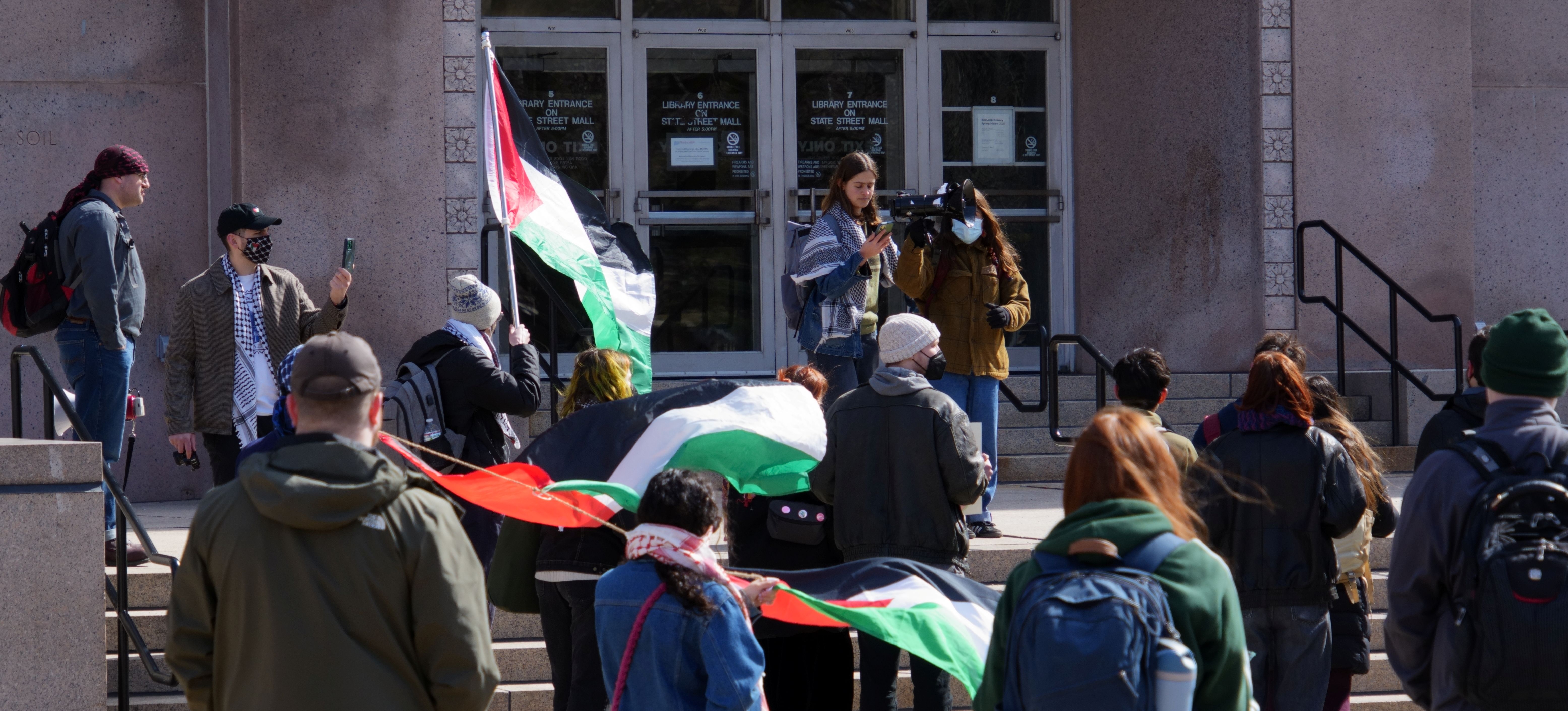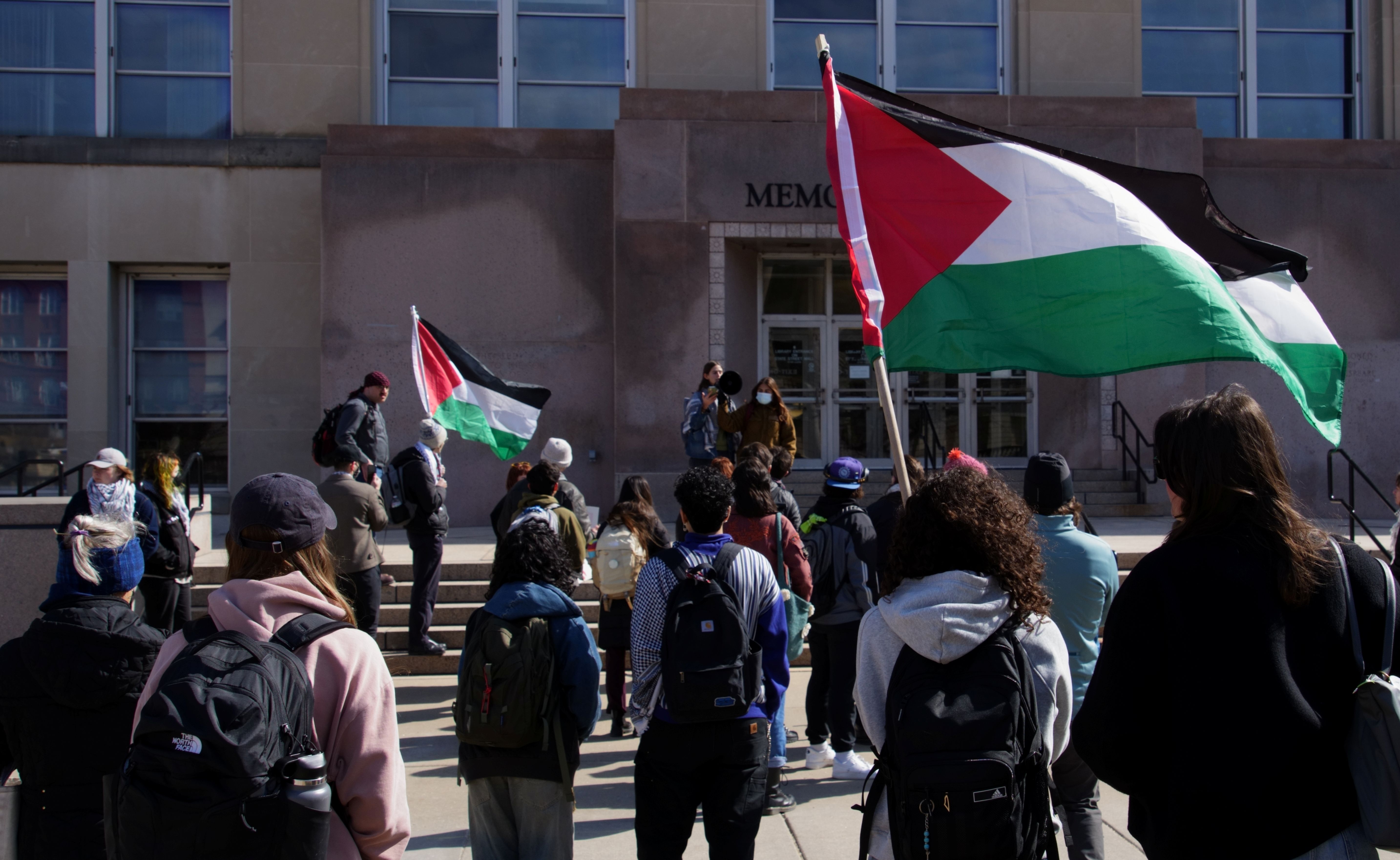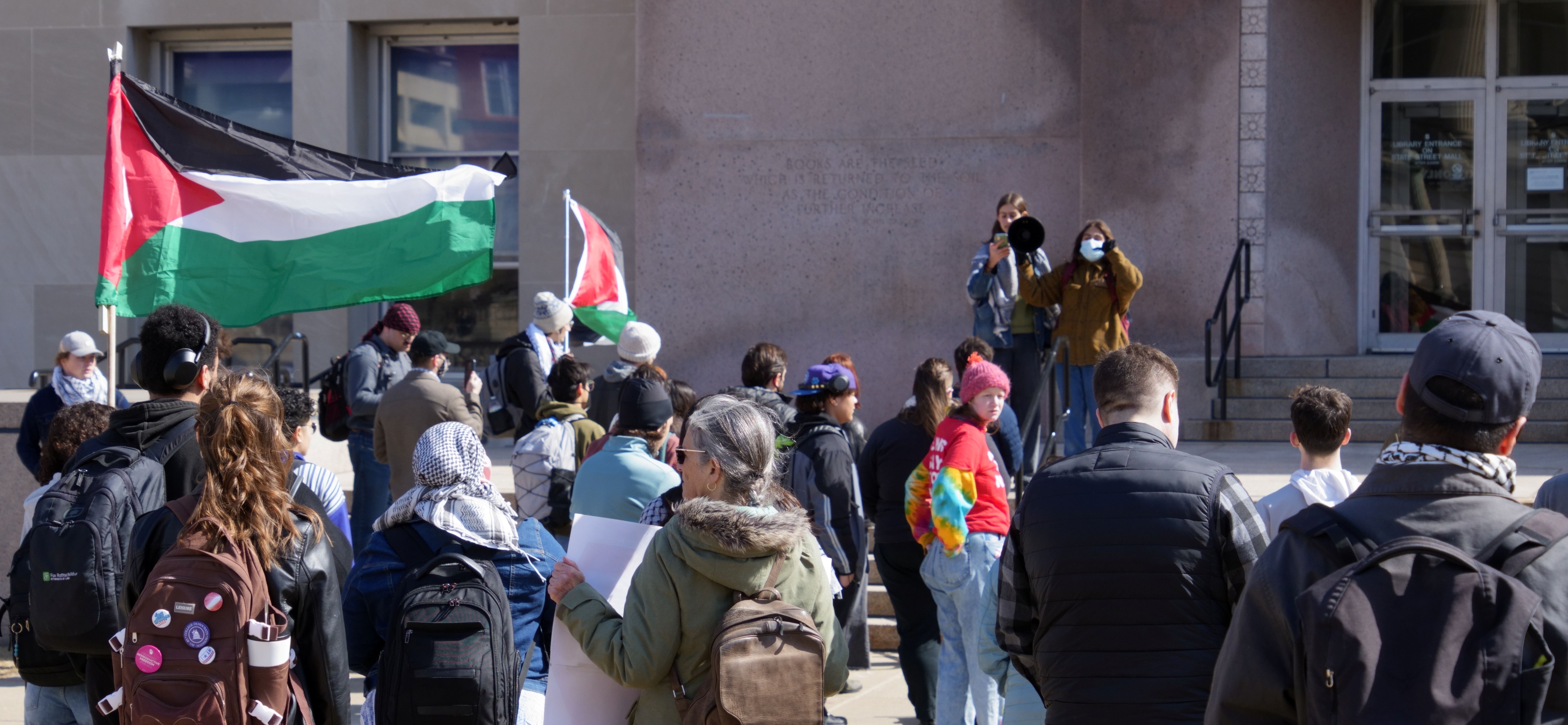 The following photos were taken at “Walk Out for Mahmoud” yesterday on the University of Wisconsin, Madison campus. Another rally is being organized by the Wisconsin Coalition for Justice in Palestine (WCJP), that I am a member of, in Milwaukee on Friday. I arrived at yesterday’s rally early and introduced myself to the small group of organizers getting ready. They were happy to hear of the support from the coalition.