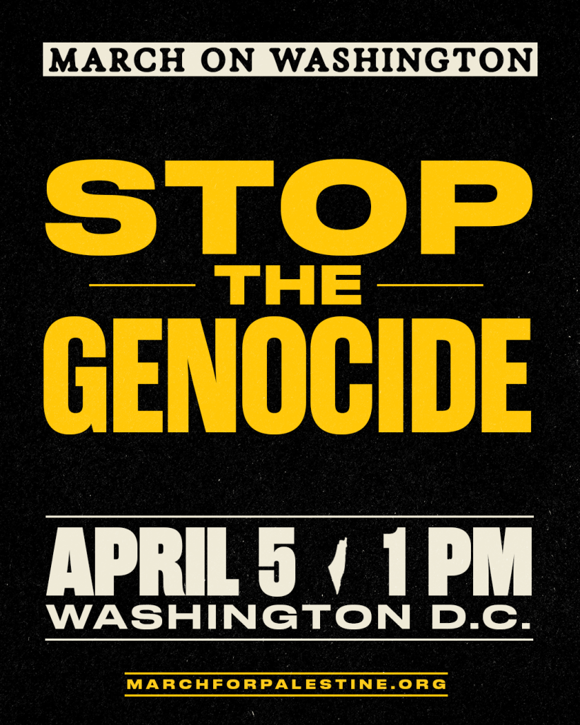 This movement is made of students, workers, teachers, artists, activists, healthcare workers, tech workers and people of conscience all over the world who will not back down in the face of repression and intimidation, and will never back down so long as Gaza is under attack. That’s why on April 5th we are standing up to Trump and his ethnic cleansing plan for Gaza, we are standing up to repression, and we are standing up to the US’s continued facilitation of the genocide in Gaza. We demand a permanent ceasefire and an arms embargo now!