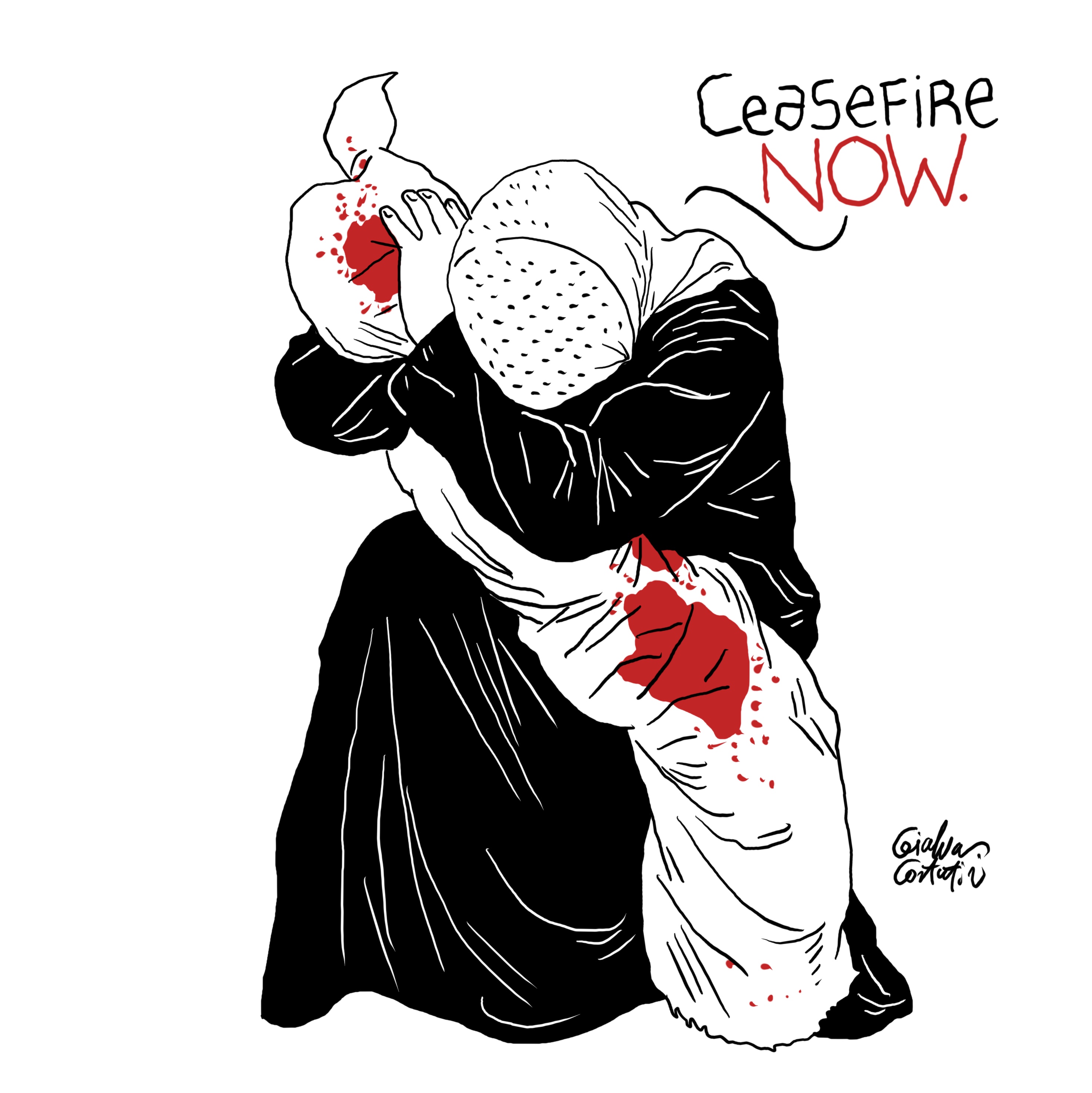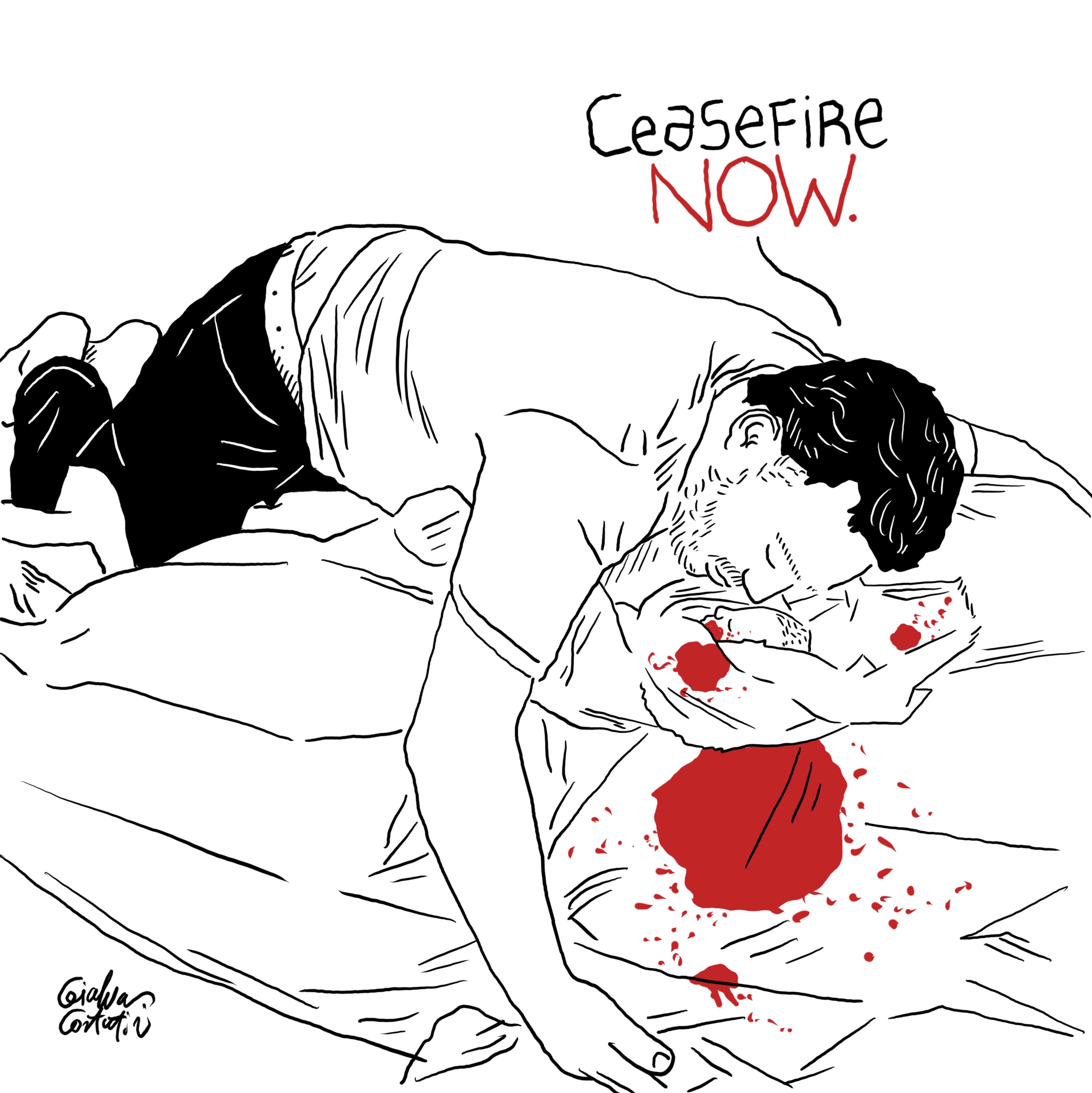 This is one of Costantini’s drawings in a post that also includes video from Rifaat Radwan, a Palestinian paramedic, who was one of fifteen first responders killed by the Israeli Defense Forces, who buried the bodies and crushed ambulances in a grave. I wrote about this, 15 first responders killed.