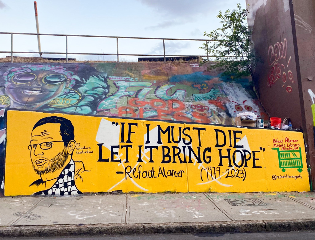 This is a mural in Atlanta, Georgia, with Gianluca Costantini’s drawing of Refaat Alareer, a Palestinian poet who was targeted and killed by Israeli Defense Forces.