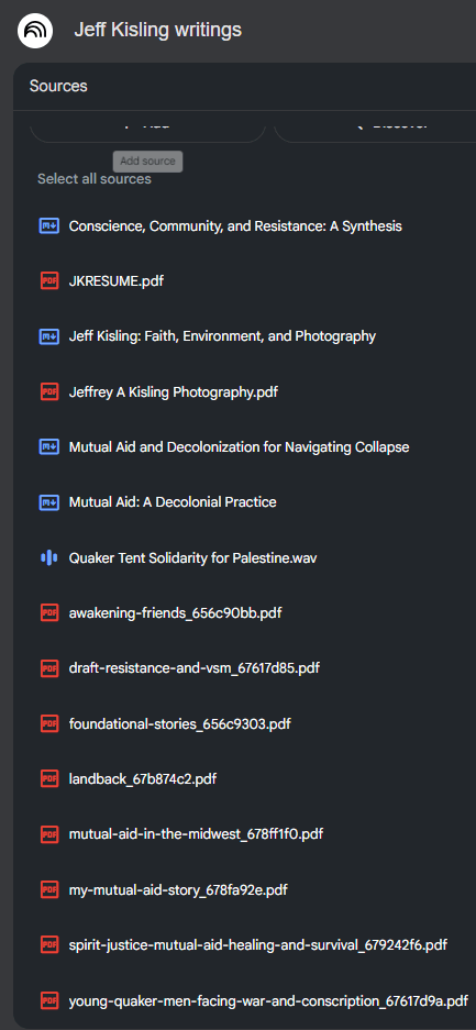 These are the sources I have loaded into the Jeff Kisling Writings notebook project.