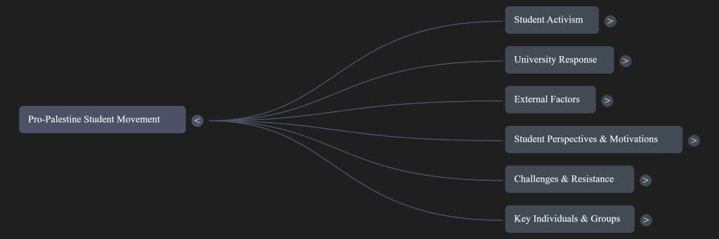 - The central argument is that the student movement for Palestine is facing strategic stagnation due to reactive cycles and burnout. Proposed shifts include developing durable structures, sustained recruitment, political education, and coalition-building.
