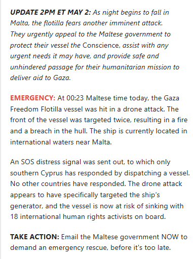 - May 2, 2025 (Friday):00:23 Maltese time (10:23 GMT): The Conscience, a Freedom Flotilla Coalition aid ship, is struck by drones in international waters approximately 14-17 nautical miles off the coast of Malta. The drones attack the front of the unarmed civilian vessel twice, causing a fire and a substantial breach in the hull, deliberately targeting the ship’s generators.